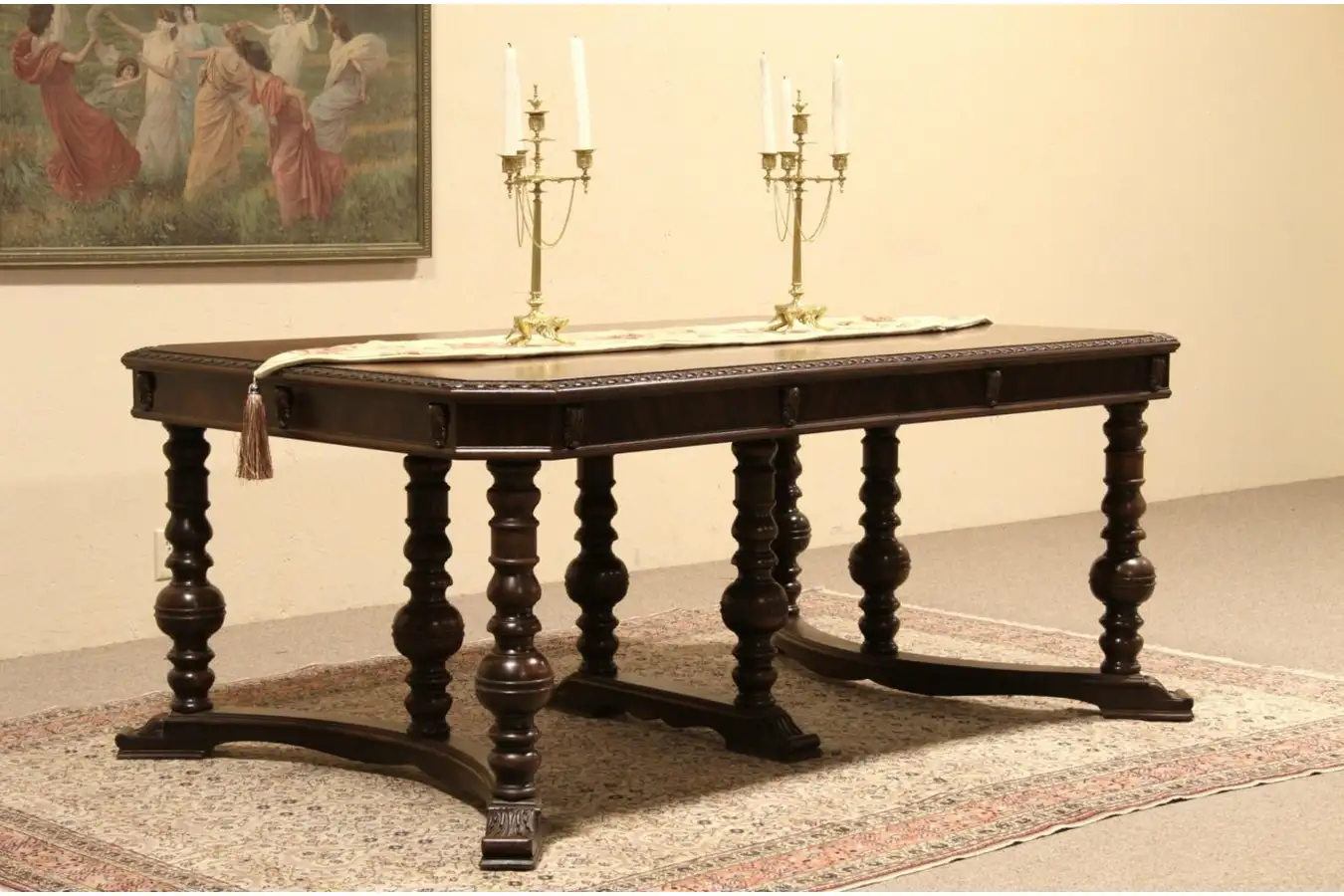 Richly carved in Renaissance style about 1925, this opulent dining table has four matching skirted leaves. The satiny finish is impeccable on curly chestnut, mahogany and walnut.