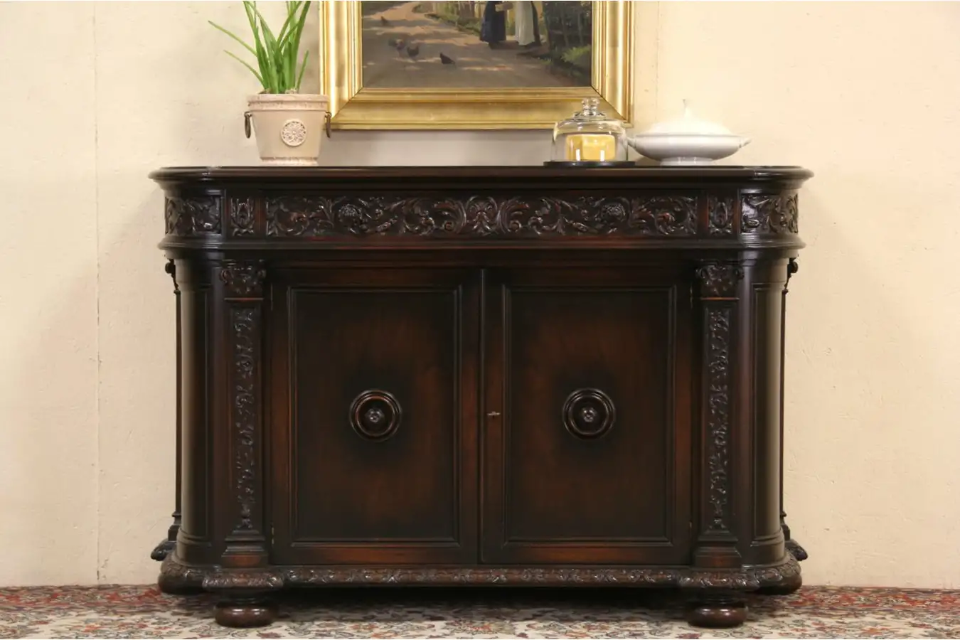 Grandly carved in the Renaissance manner around 1925, this imposing sideboard, server or console cabinet is solid walnut.