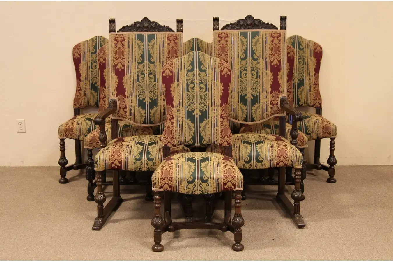 Palatial Renaissance design furniture from the 1920's, this group of ten (7 + 3 slightly different) dining chairs includes two throne style armchairs.