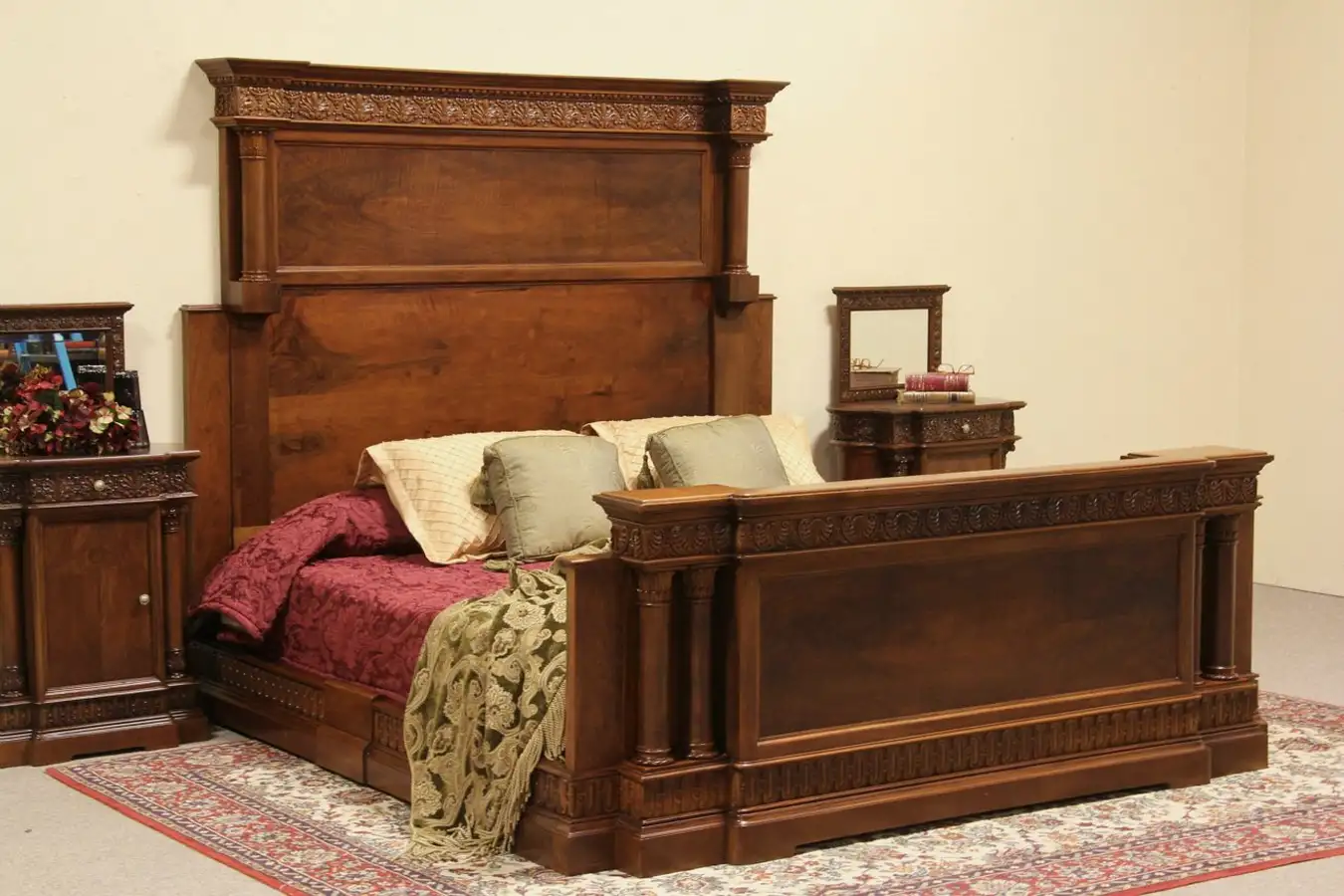 Richly carved in Renaissance design about 1910, a palatial king size bed has columns and deep moldings. Walnut and cherry with matched grain panels, the deep moldings and classical motifs in the friezes are stately.