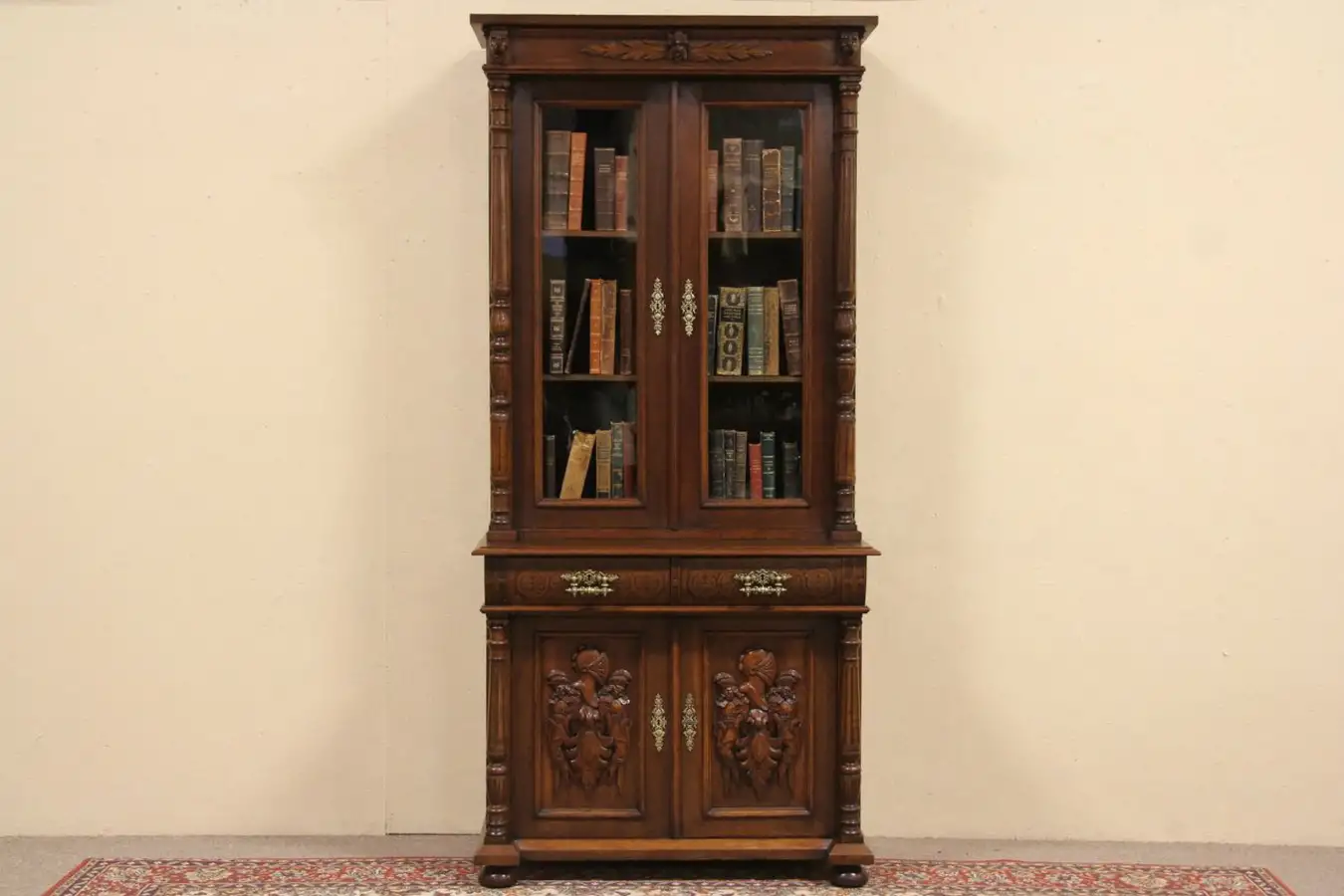 Hand carved In France of solid oak about 1890, this imposing bookcase has high relief sculptures of knights. Lion heads and fluted columns have masterful.