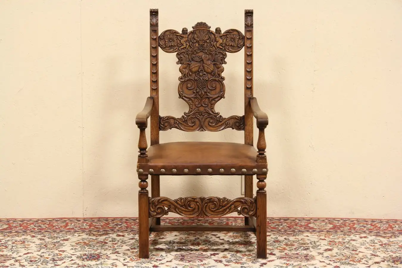 A spectacular desk or hall chair was carved of solid oak in the Renaissance manner about 1910. A hand carved family crest with lion and grape motifs in high relief show remarkable artistry. The original finish is very well preserved, it has been waxed and polished and requires only an occasional rub with a dry cloth to retain its warm antique patina.