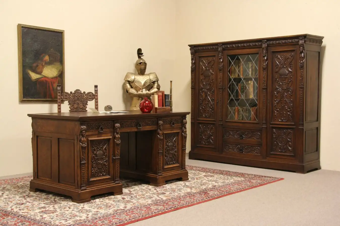 A spectacular library set was carved of solid oak in the Renaissance manner about 1910. Hand carved figures and motifs in high relief show remarkable artistry. The original finish is very well preserved, it has been waxed and polished and requires only an occasional rub with a dry cloth to retain its warm antique patina.