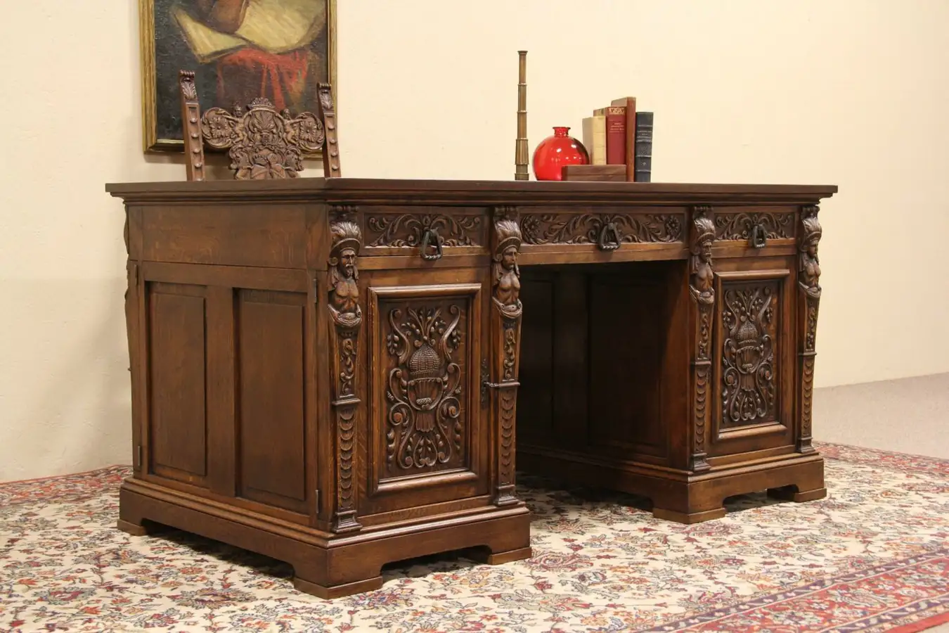 A spectacular library partner's desk was carved of solid oak in the Renaissance manner about 1910. Hand carved figures and motifs in high relief show remarkable artistry. The original finish is very well preserved, it has been waxed and polished and requires only an occasional rub with a dry cloth to retain its warm antique patina.