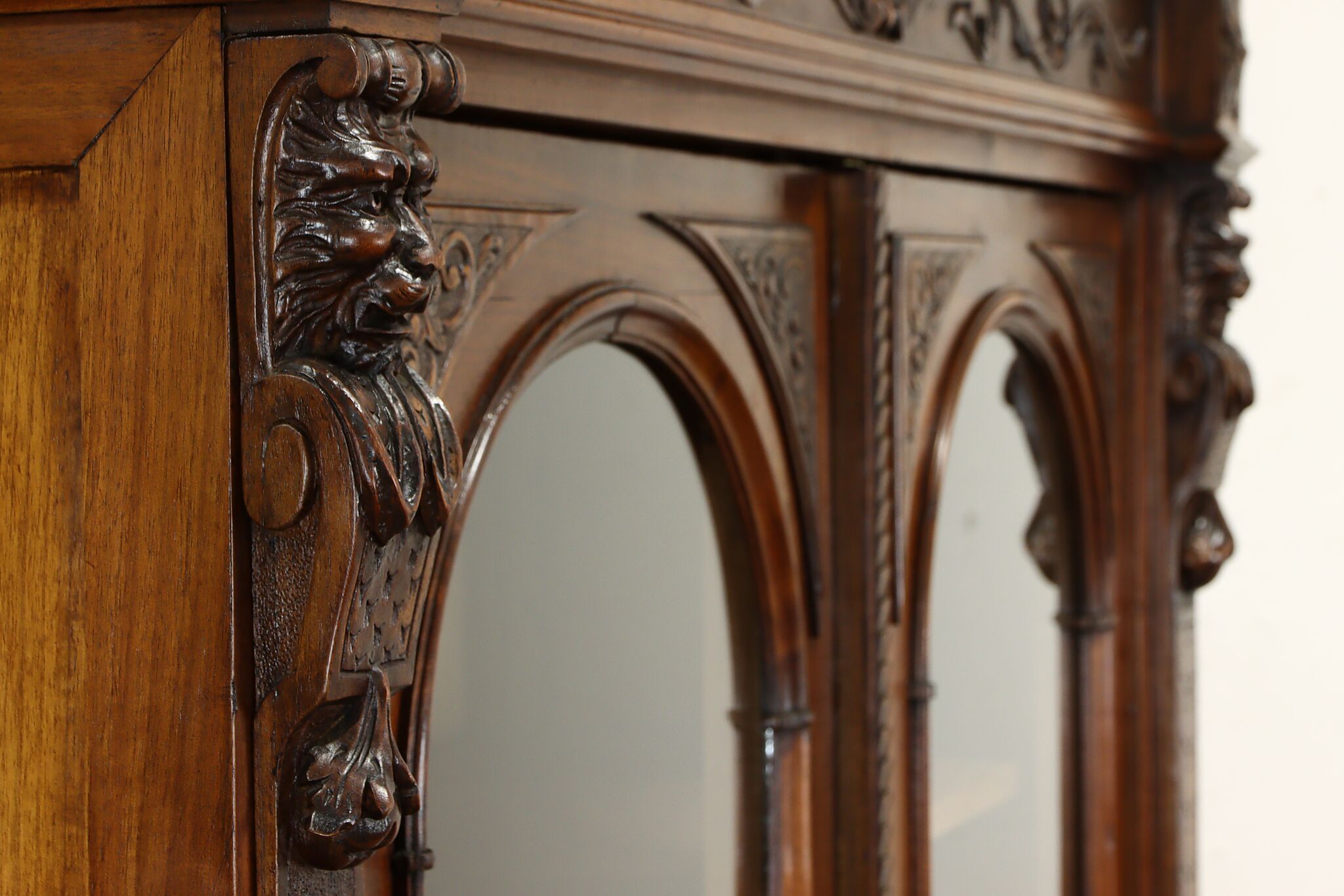 Hand carved of walnut for a palazzo in northern Italy, this magnificent library or office bookcase from about 1900 has three dimensional sculptures of lion heads, dragons and classical motifs. Lavish artistry captures the Renaissance manner.