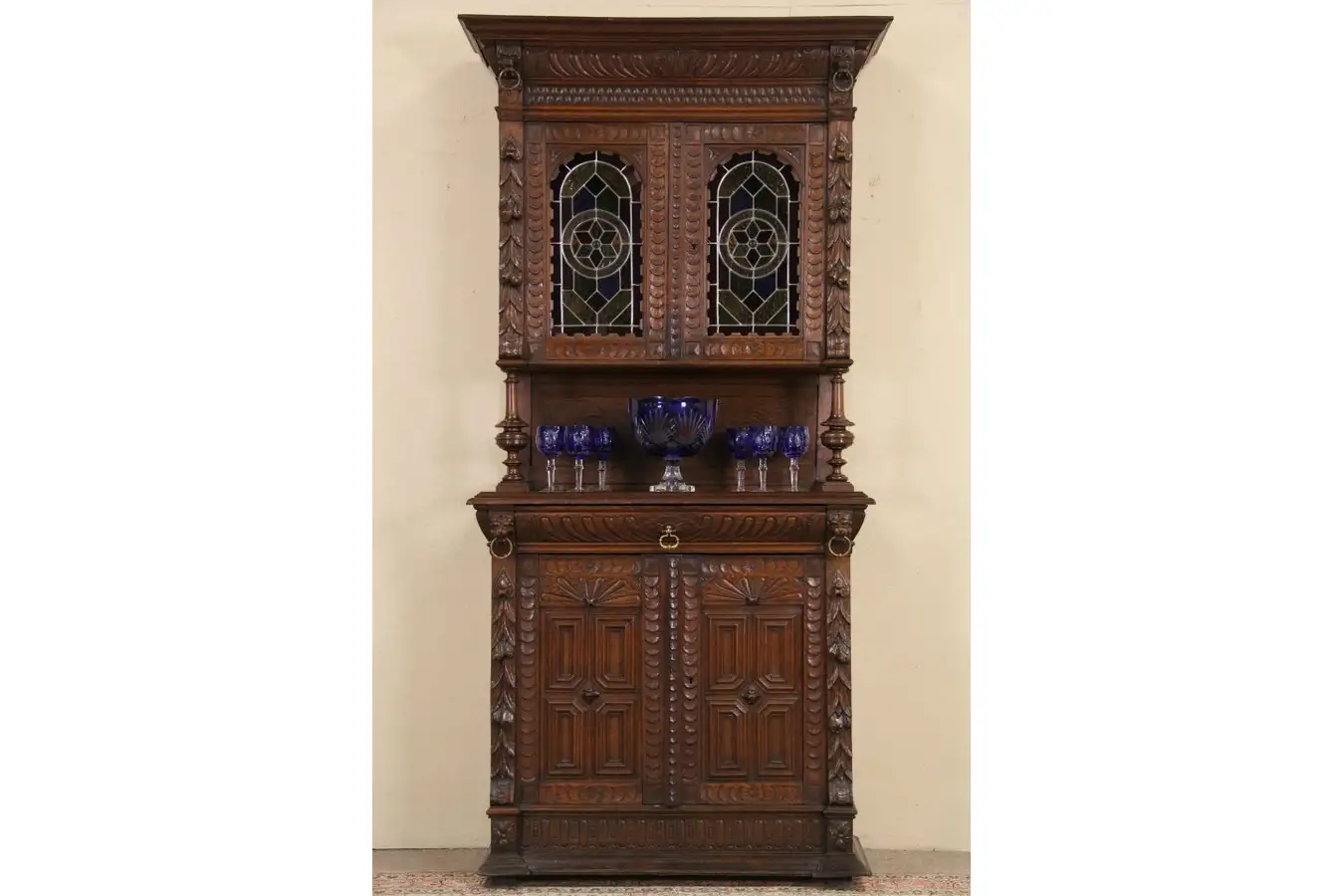 Hand carved of solid oak in the Renaissance manner, a sideboard cabinet from the 1880's has stained glass windows and lion head, nut and shell motifs.