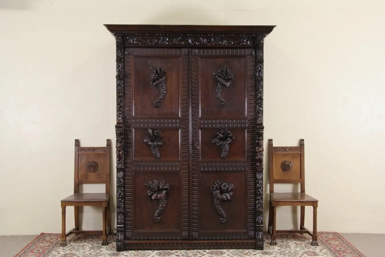 A spectacular Renaissance style armoire or cabinet from France was hand carved with deeply sculpted angels, lion heads and cornucopias of fruit and flowers.