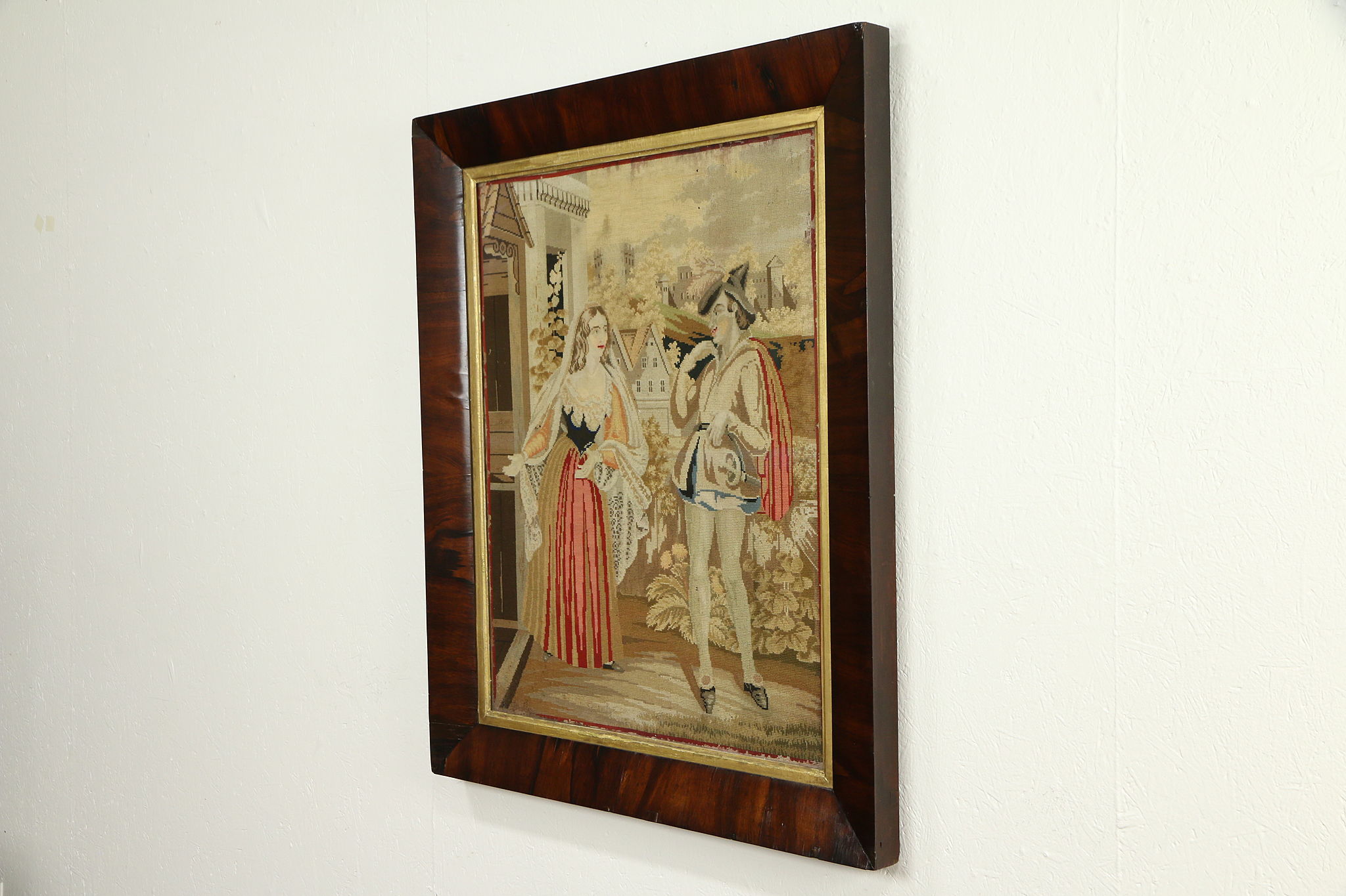 A genuine hand stitched needlepoint and petit point tapestry from about 1850 depicts a couple in Renaissance garb with a town in the background. There is fading, wear and holes in this Victorian period work of art. The backside is photographed and has been protected with a cardboard backing.