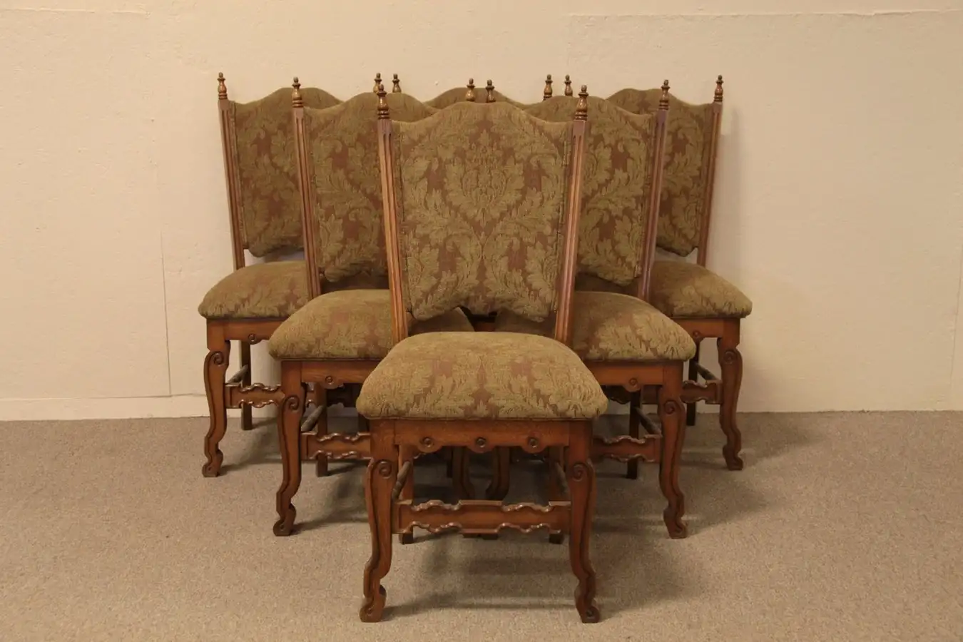 The six very solid and comfortable chairs are newly upholstered in a neutral soft rich fabric. They have spring seats, and measure 19" wide, 24" deep and 41" tall. Table is not included.