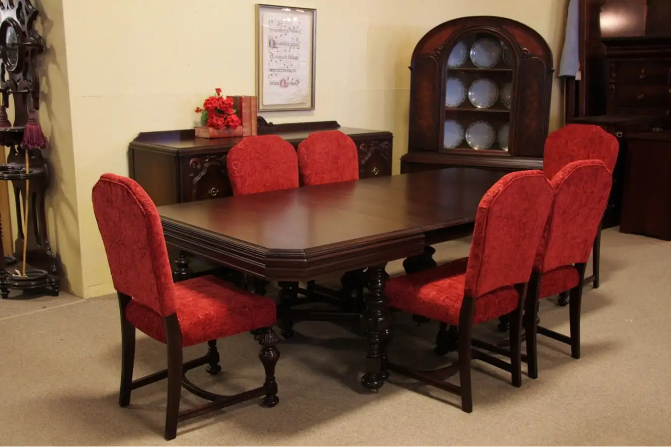 The 9 piece matched set includes an 8' table, 6 newly upholstered chairs, sideboard or buffet and china cabinet. All pieces are in wonderful condition with the ambience of an English country manor house.