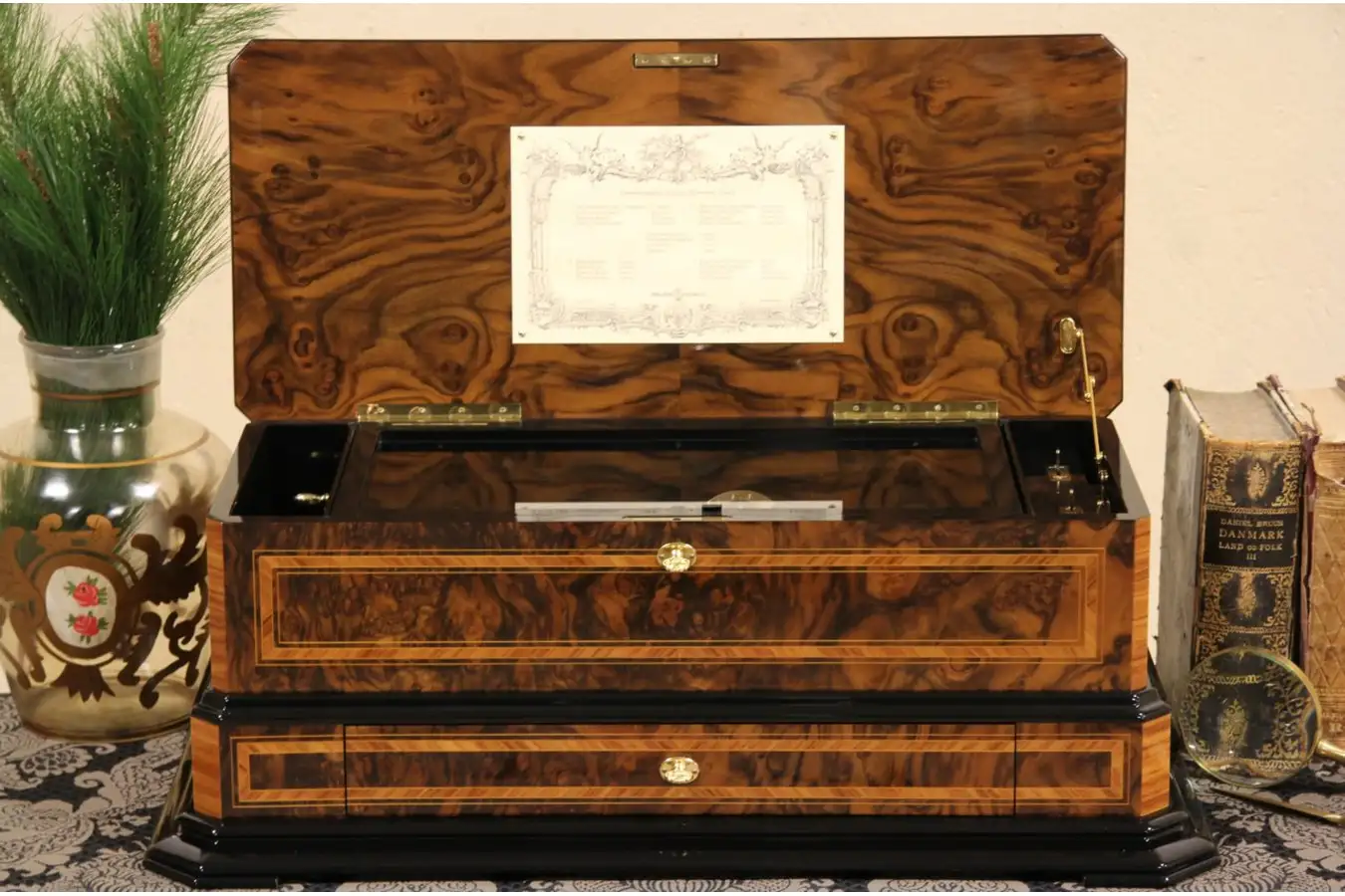 In pristine condition, this lovely player works perfectly. The jeweled mechanism is almost silent, there are two "combs" and a lever wind. A dazzling inlaid walnut burl and tulipwood banded case is brilliantly polished. The lower drawer holds the other four cylinders.