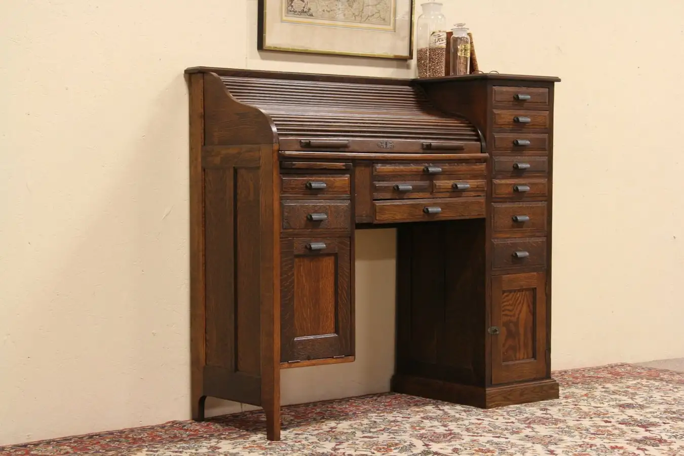 This remarkable stool height roll top desk from about 1900 was said to have been made for a physician who was also his own pharmacist.