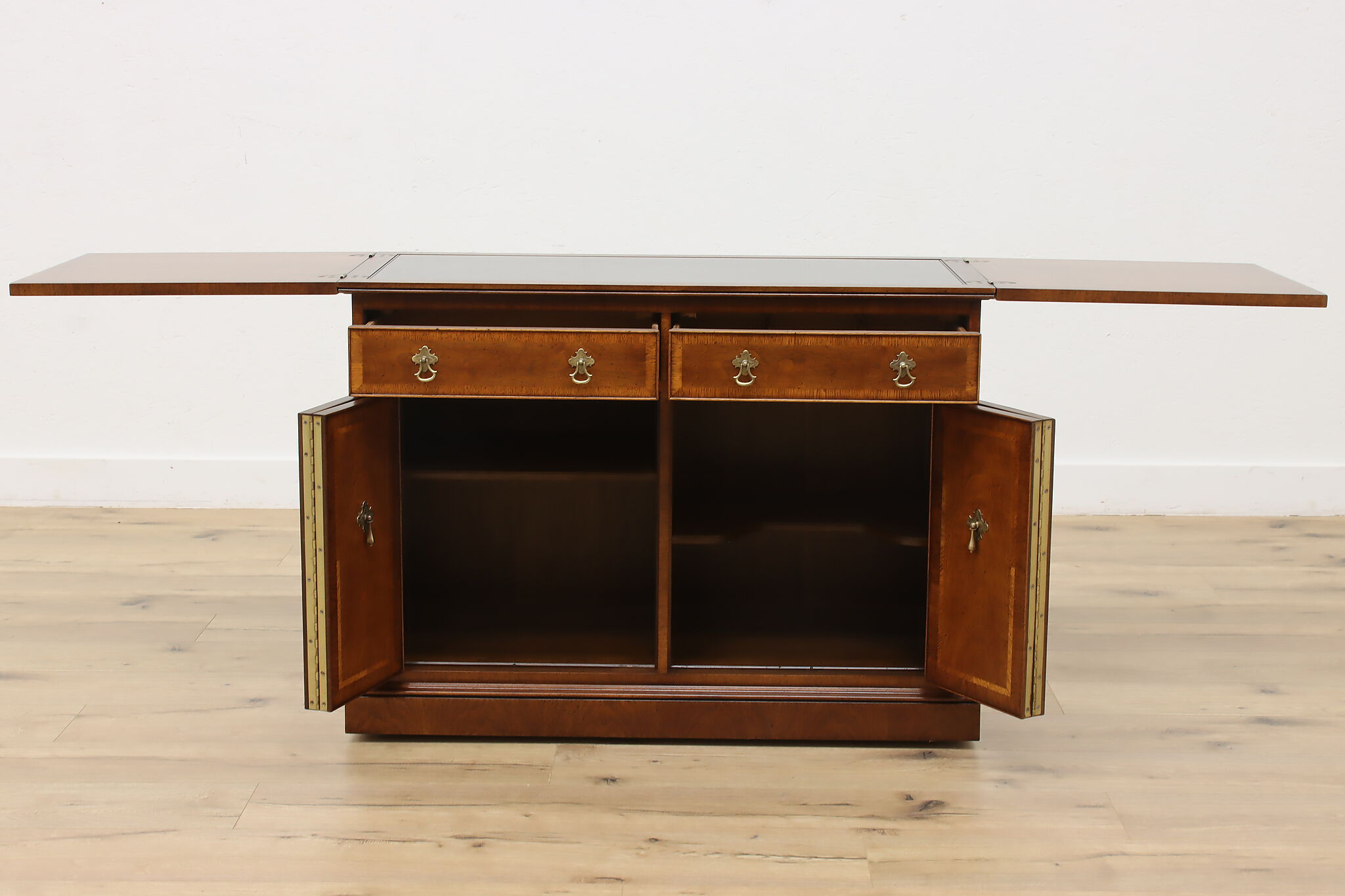 This Georgian design rolling bar cabinet or server has a double flip top that forms a large serving area.