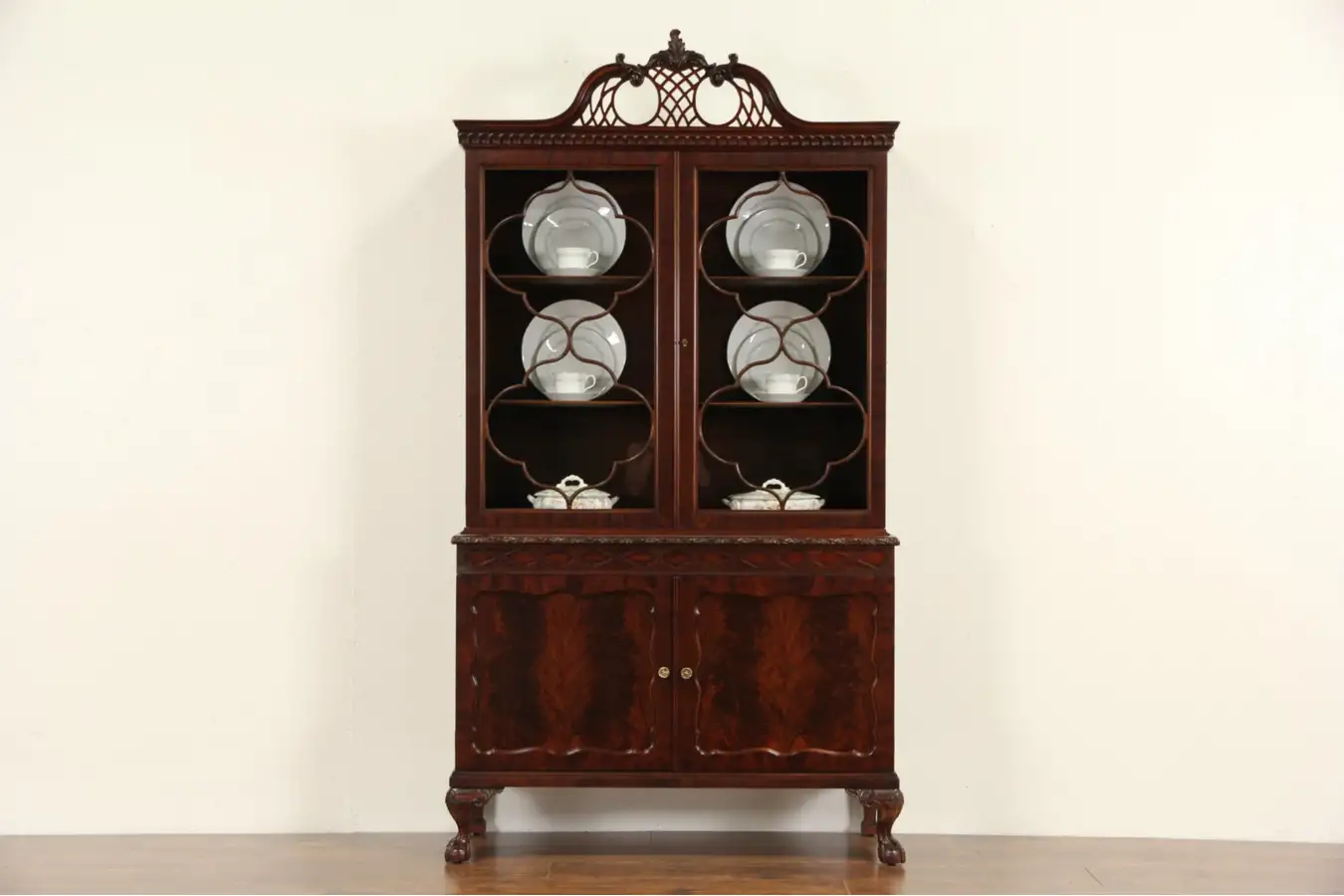 This classic Georgian style china display cabinet or bookcase is about 60 years old, and was made by famous maker, "Romweber of Indiana." Note the graceful design with finely detailed classic ball and claw feet.