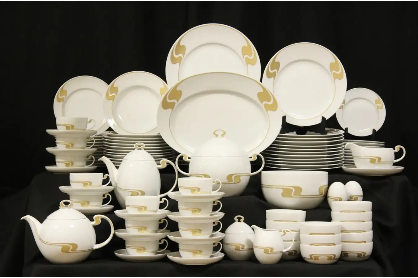 Signed by premier German china maker, "Rosenthal," this Bjorn Wiinblad Designer Studio Line or "studio-linie" set for 12 plus serving pieces is in the "Asimmetria Gold" pattern.