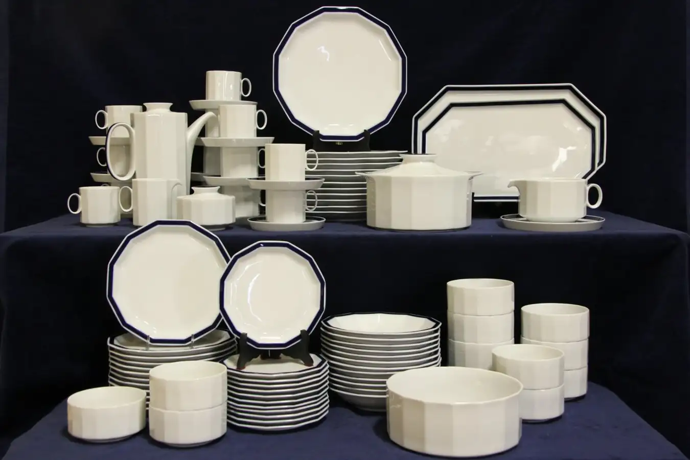 Signed by premier German maker, "Rosenthal" for their top quality "Studio Line (Linea)," this set of china for 12 plus serving pieces is in the Mykonos Blue Rim Polygon pattern.