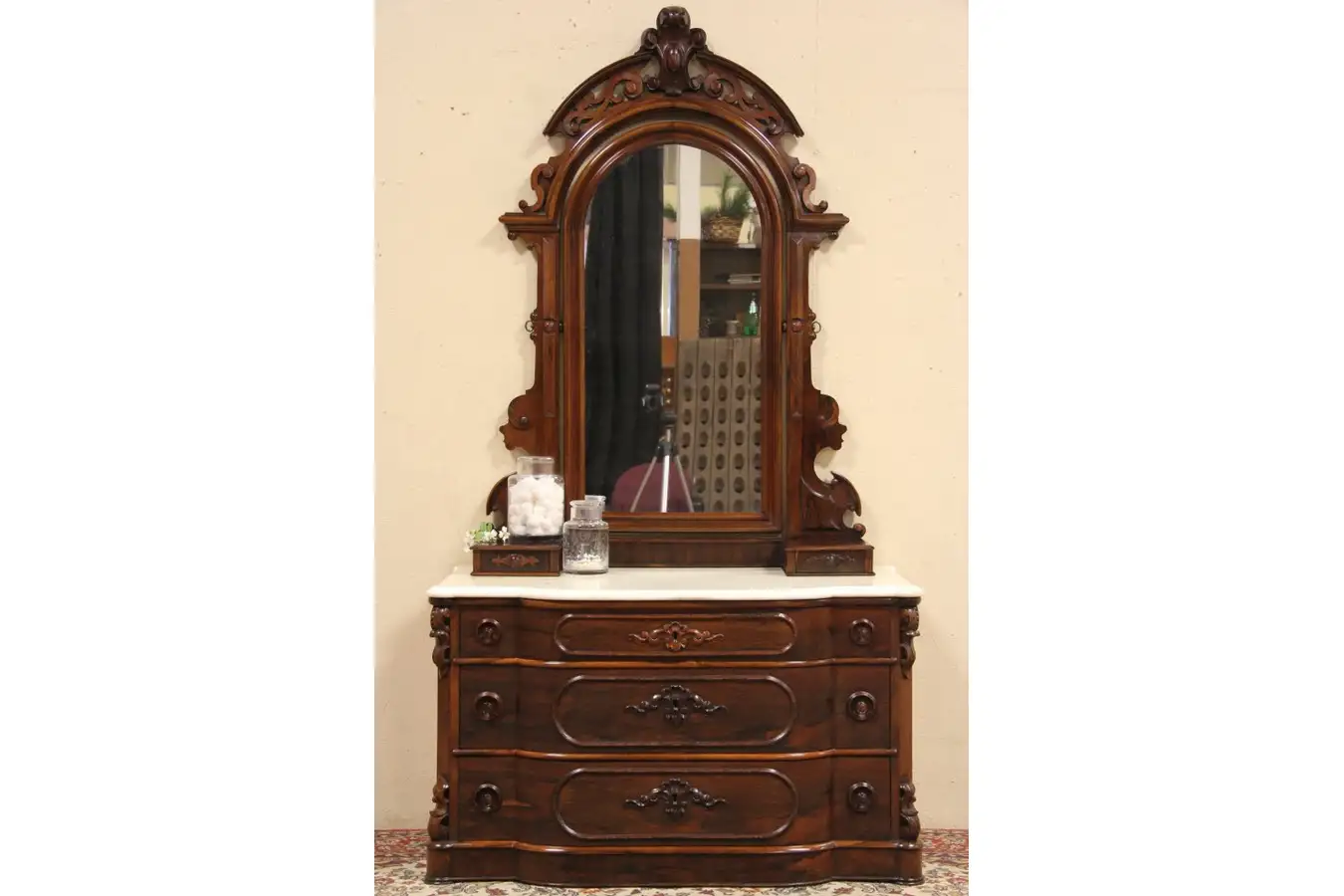 A stellar Victorian period chest or dresser from about 1860 is genuine rosewood with a marble top and could be a vessel sink vanity.