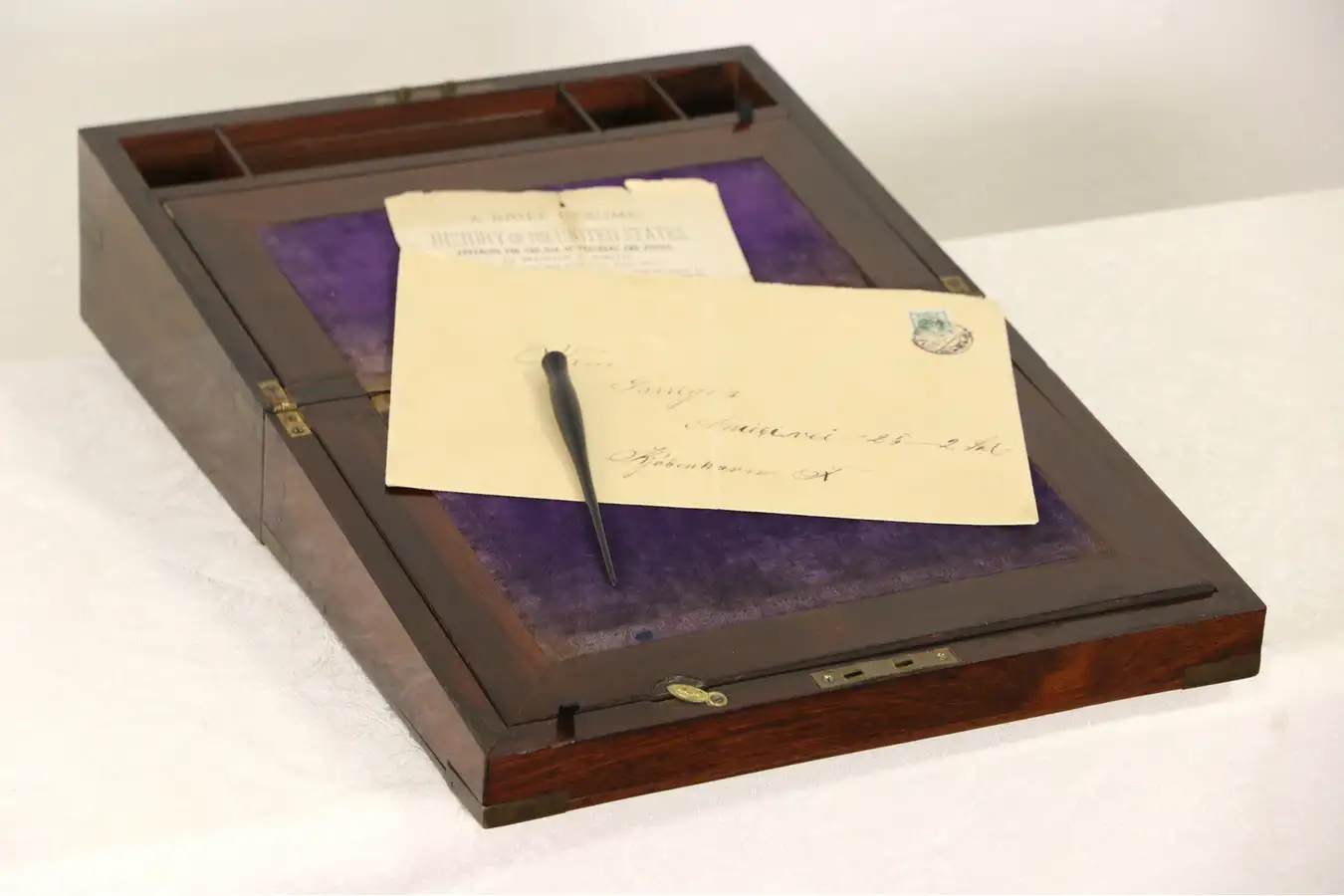 An 1880's lap or travel desk was the laptop of the Victorian era. Genuine rosewood inlaid with brass, the old finish is very well preserved with a few mars and has been waxed and buffed. All that is needed to maintain the patina is an occasional wipe with a soft dry cloth. There are some shrinkage separations from age near the corner mounts as shown.