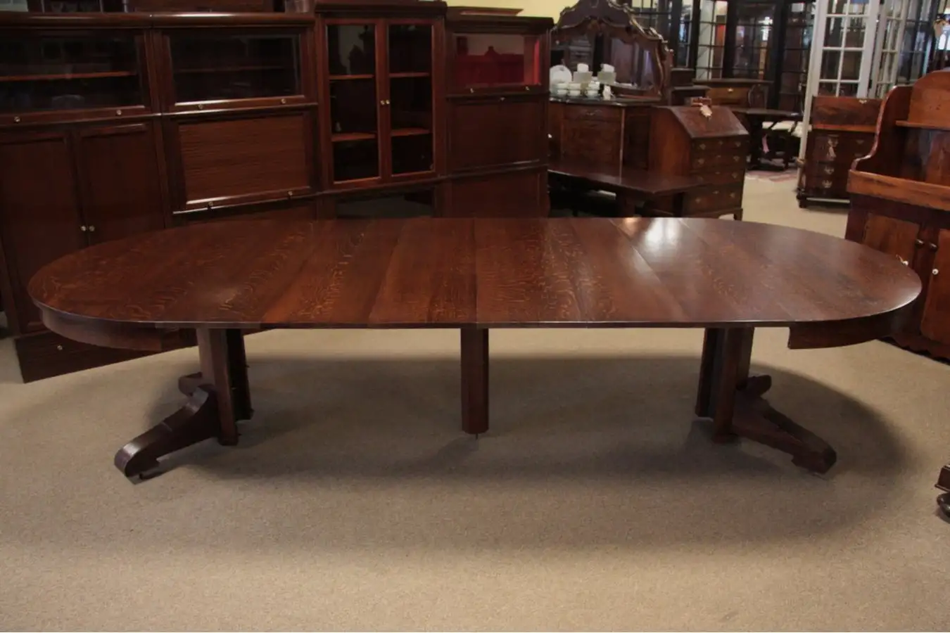The pedestal splits into 2 halves when extended, revealing a center leg for extra support. There are six 12" leaves, all fit and match very well. This antique table opens and closes smoothly, and the pedestal has the graceful and simple lines from the Mission Oak period.