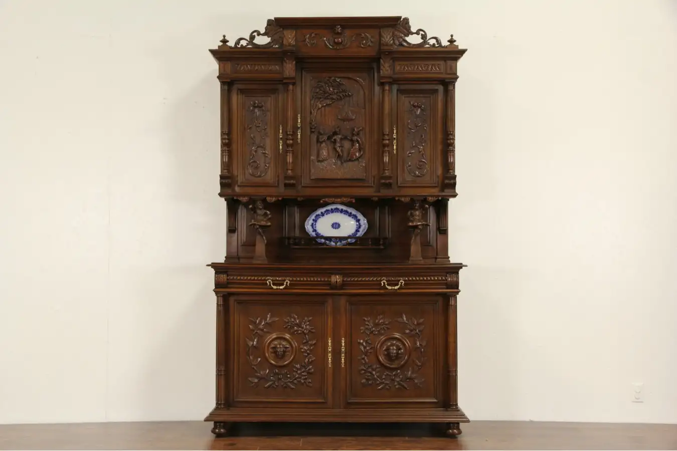 The artistry in this solid walnut cabinet from around 1890 shows remarkable detail and marks from hand chiseling. Carving in high relief includes a palace garden dancing scene with a fountain.