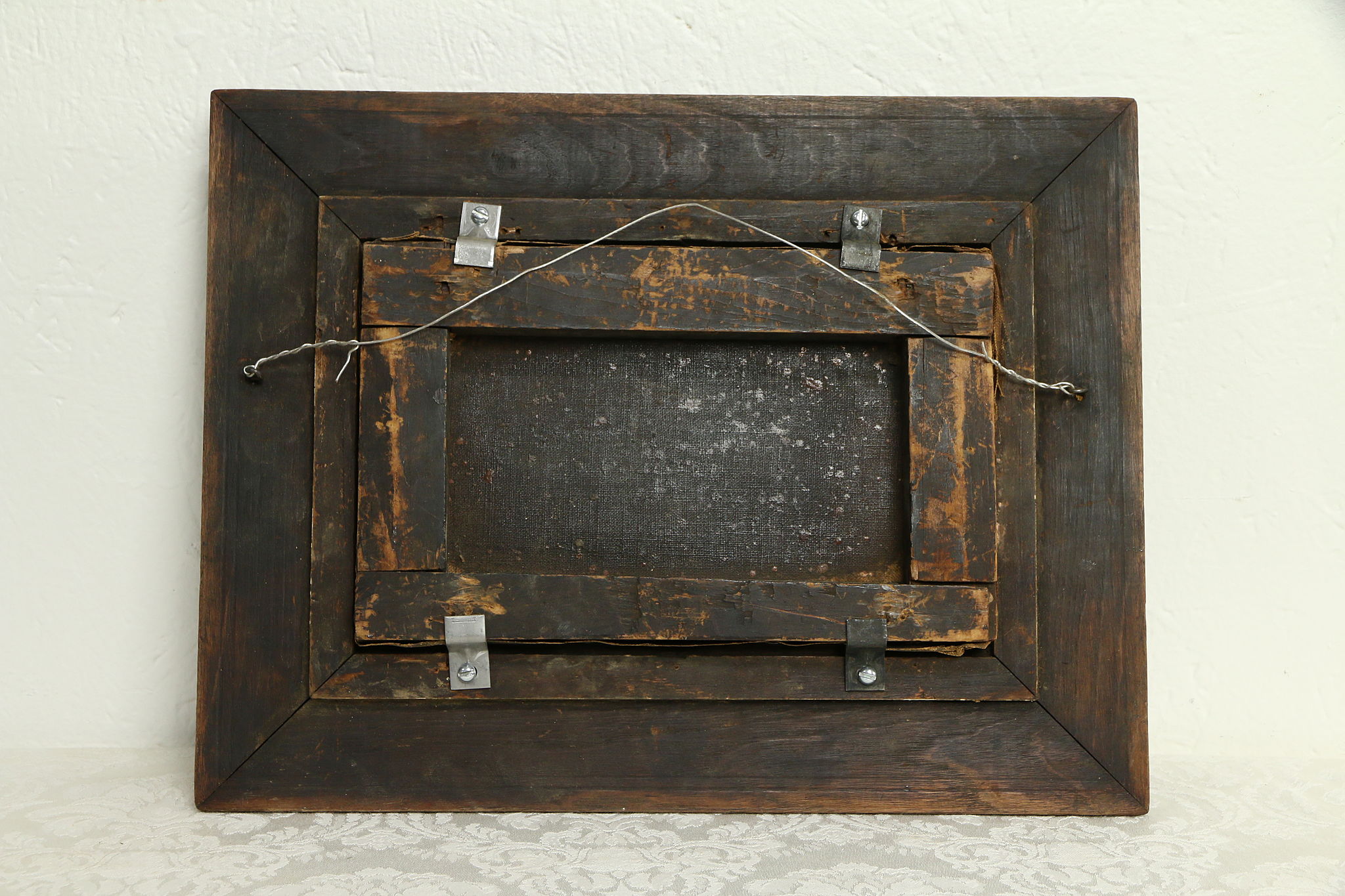A charming little original oil painting on canvas depicts a sailing ship at sunset, and dates from around 1860. We find no signature on this American work of art. The liner is well worn, the restored finish on the original frame is in excellent condition.