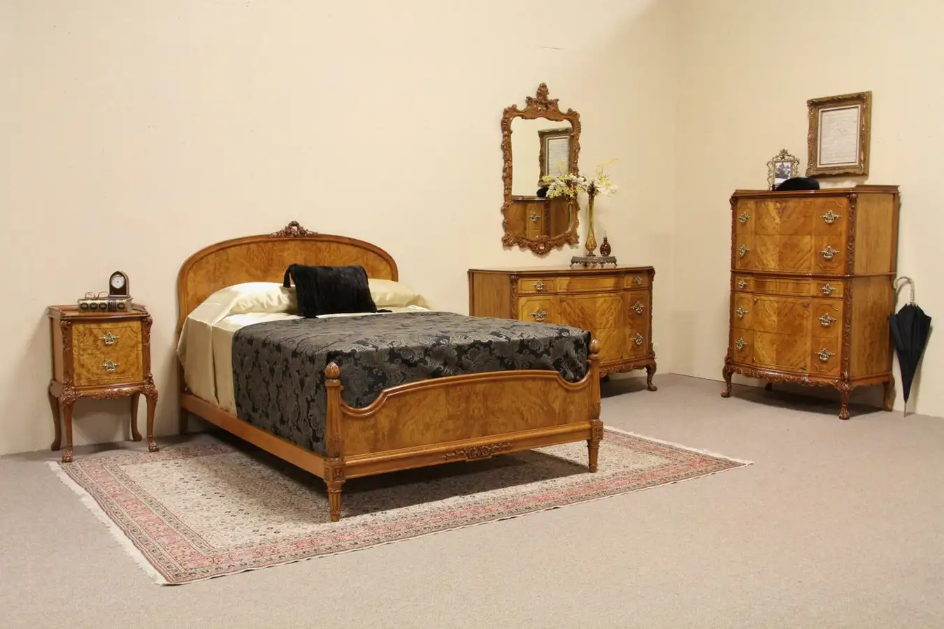 A 5 piece bedroom set in shimmering satinwood includes a full or double size bed, tall chest, dresser, wall mirror and nightstand, expertly crafted about 1940.