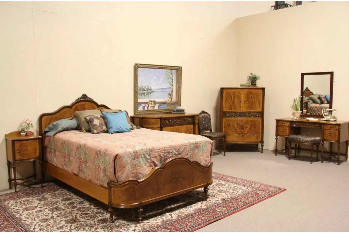 A luxurious 1925 era full or double size bed is shimmering satinwood with delicate inlaid marquetry. The satiny finish is in excellent condition with warm antique patina on this American made furniture. Carved details and fluted columns are sophisticated. Book matched and banded grain is gorgeous. Slats are included to support a standard full size innerspring and mattress, at 20" total height as shown.