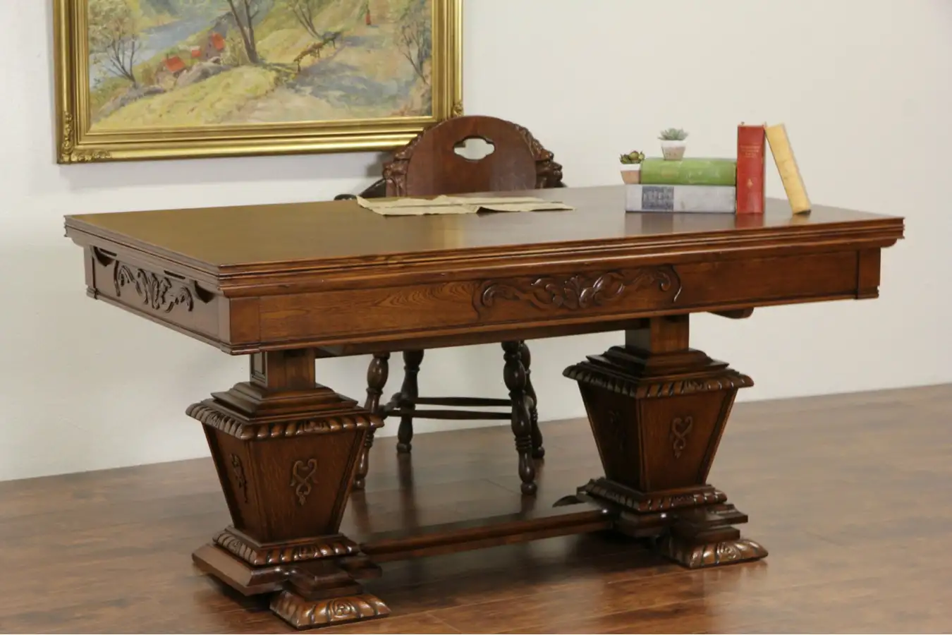 Carved of oak in Scandinavia, this 1920's library, dining table or writing desk has deep moldings and substantial pedestals.