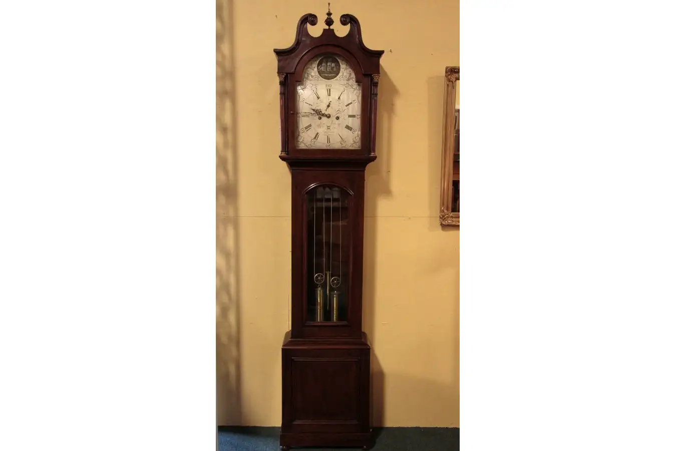 A wonderful Scottish tall case or grandfather clock is signed "Alex. Nimmo, Linlithgow" on the hand engraved dial. A hand painted clipper ship rocks at the top with each "tick" of this prestigious antique clock. The 8 day movement is cleaned and oiled, and strikes the hour.