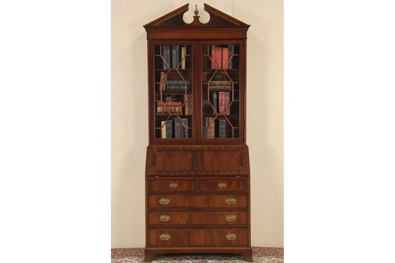 The finish on mahogany is in excellent condition with only minor mars, one is on the left interior, see photos. The drop front has gold tooled leather and supports automatically extend when opened.