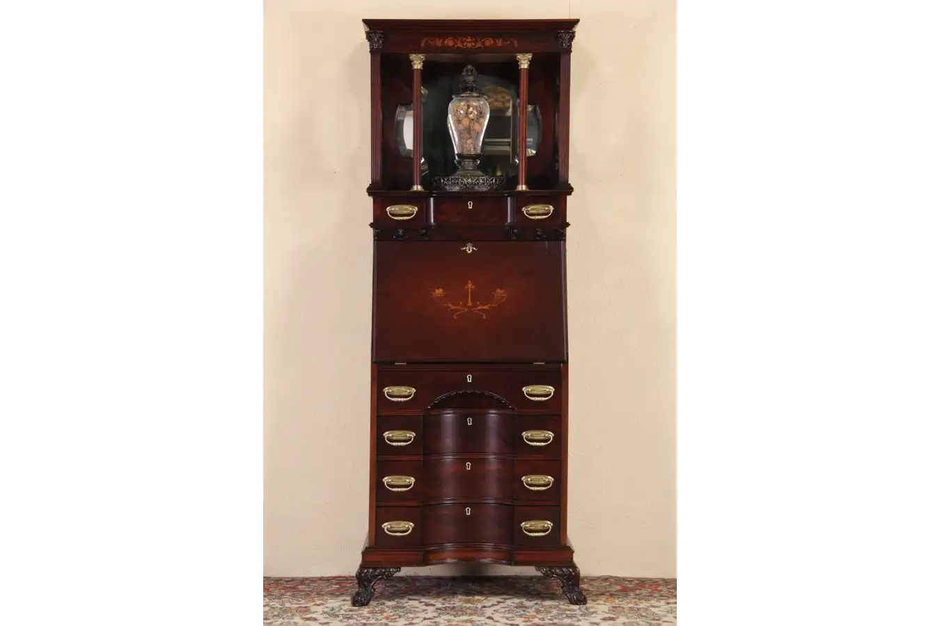 This absolute jewel of a secretary desk was beautifully crafted about 1900 with inlaid marquetry of precious woods and mother of pearl. Original bronze pulls, the shaped and beveled mirror plus columns with Corinthian capitals are exquisite on this American made furniture. Fine detailing and the concave front are delightful.