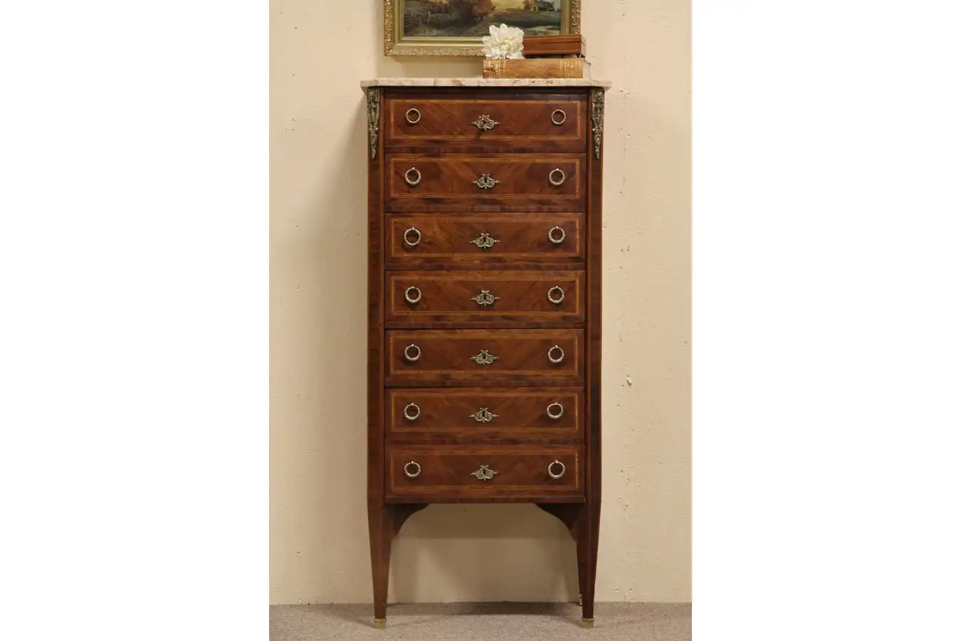 This 1900 era French "Semanier," or "weekly" 7 drawer lingerie chest has a drawer for each day. Expert craftsmanship and beautiful European design is only part of the charm of this exquisite antique chest with a marble top.