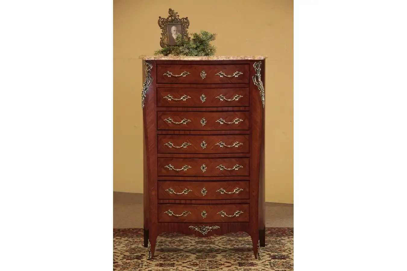This French "Semanier," or "weekly" 7 drawer lingerie chest, has a drawer for each day. Expert craftsmanship and beautiful European design is only part of the charm of this exquisite antique chest with a marble top.