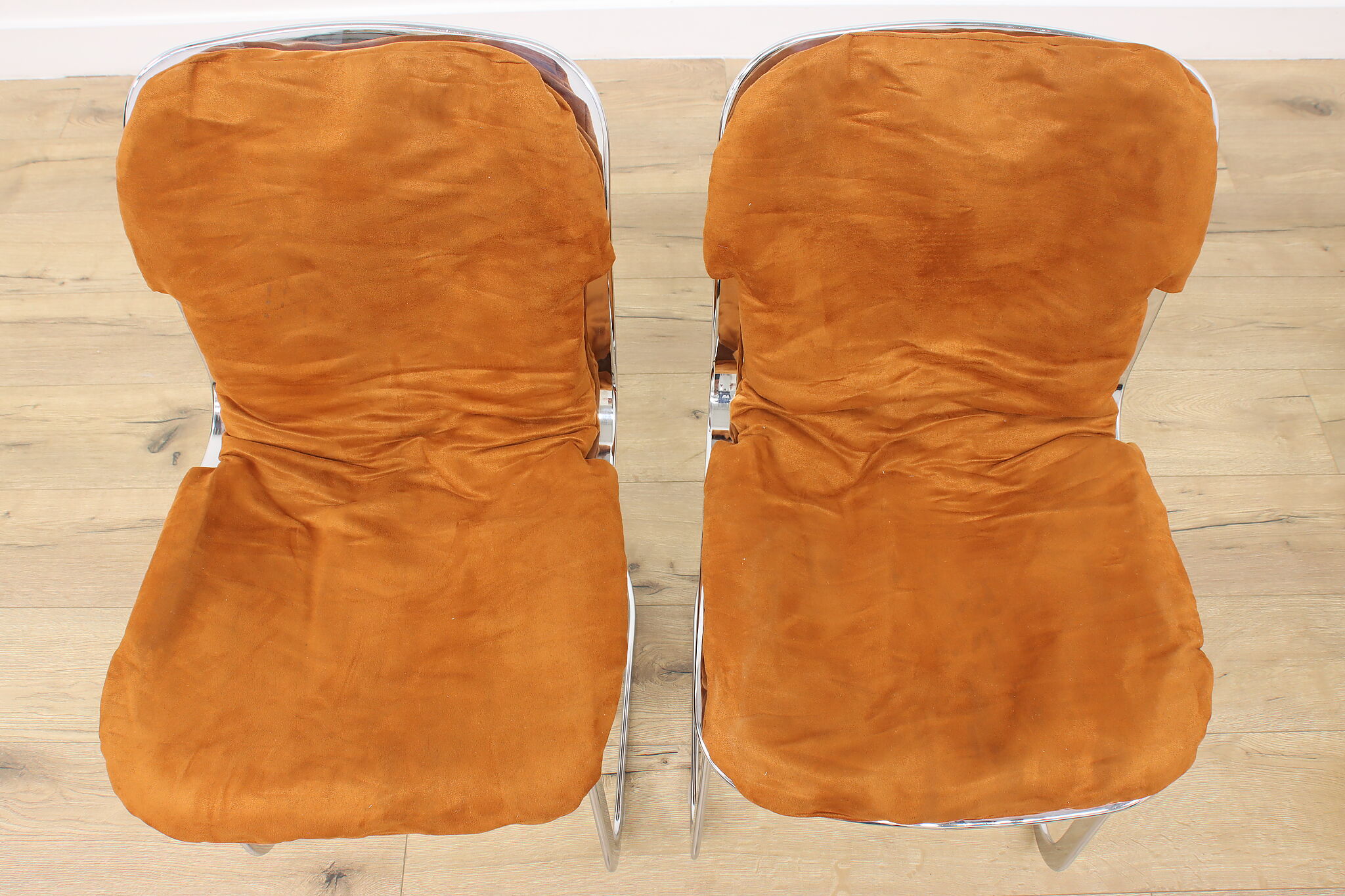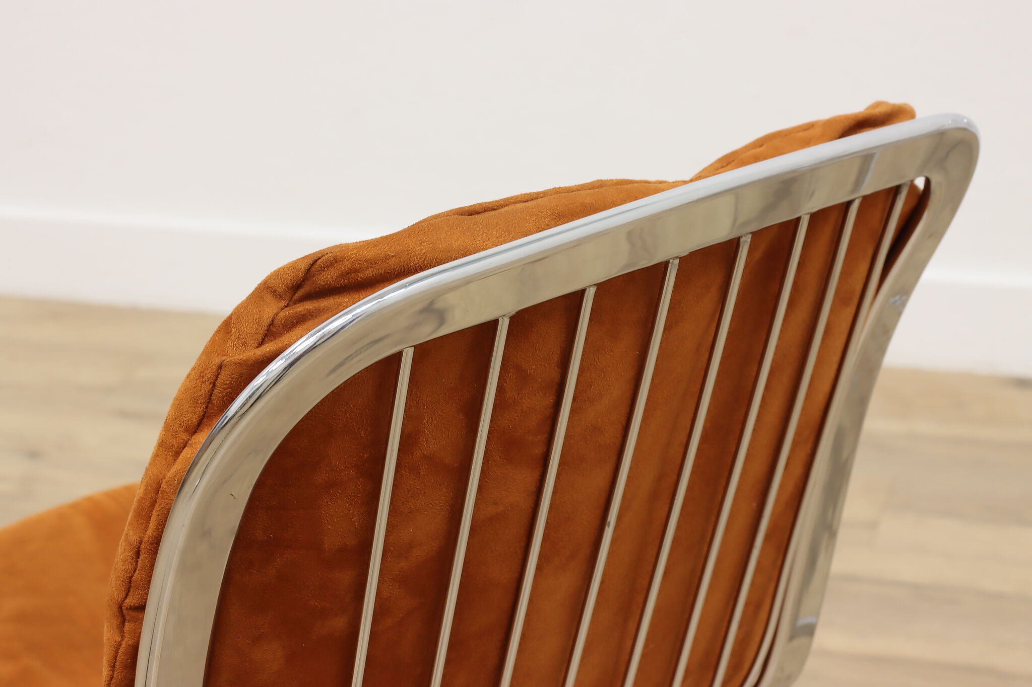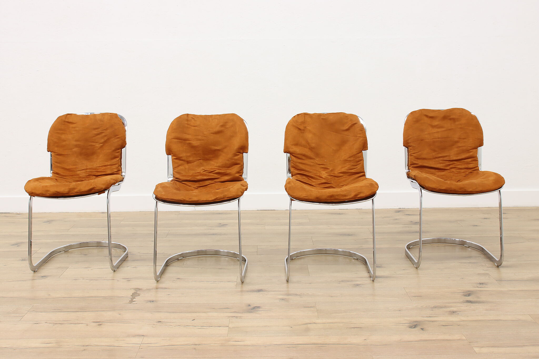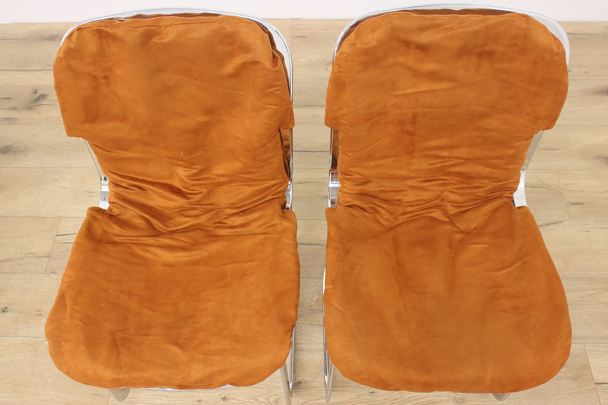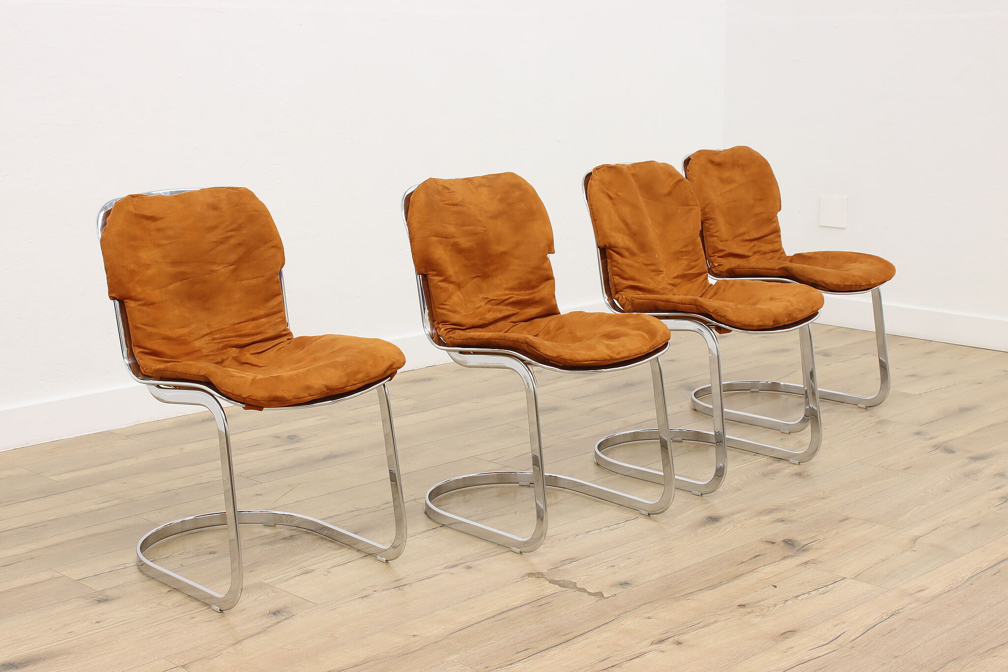 When thinking of the Midcentury Modern period, most people picture gleaming wood credenzas and open bookcases. However, the period also produced chrome pieces with different fabrics to create visual contrast. This set of four Italian chairs includes suede cloth and worn suede leather upholstery options for you to choose which one best fits your space!