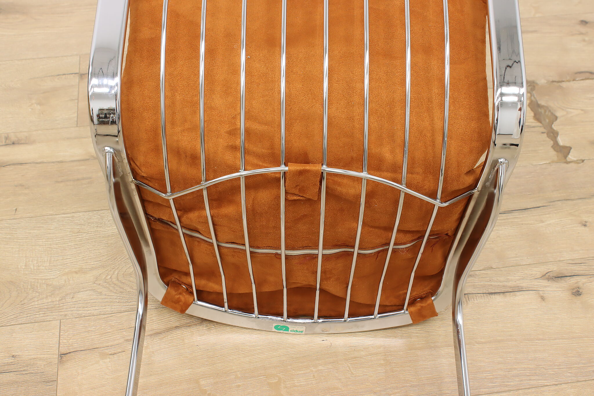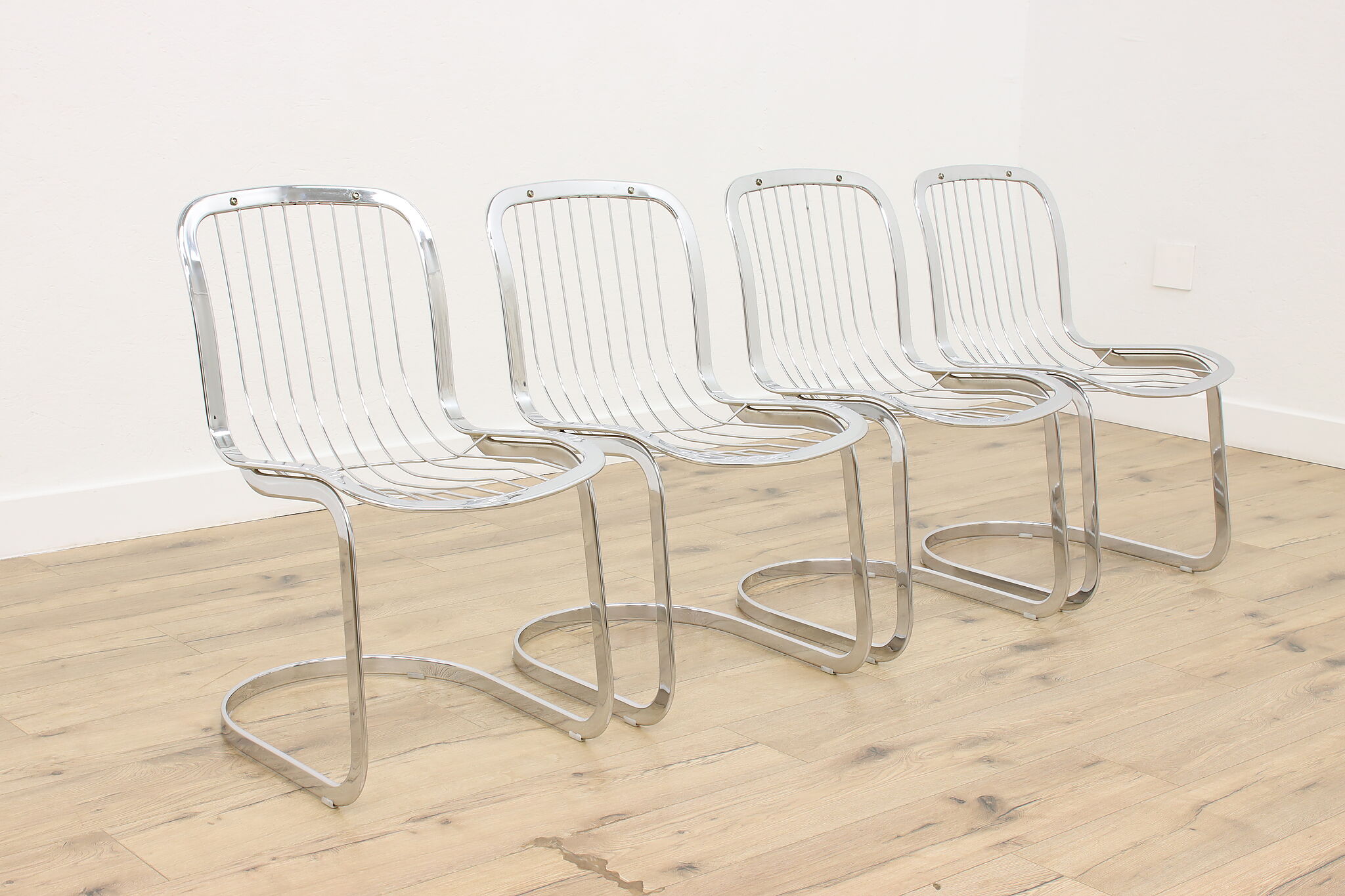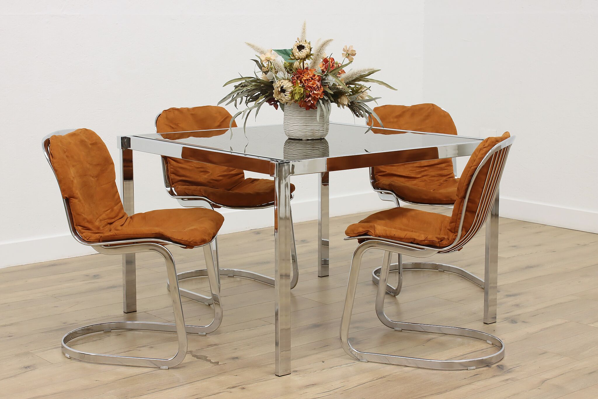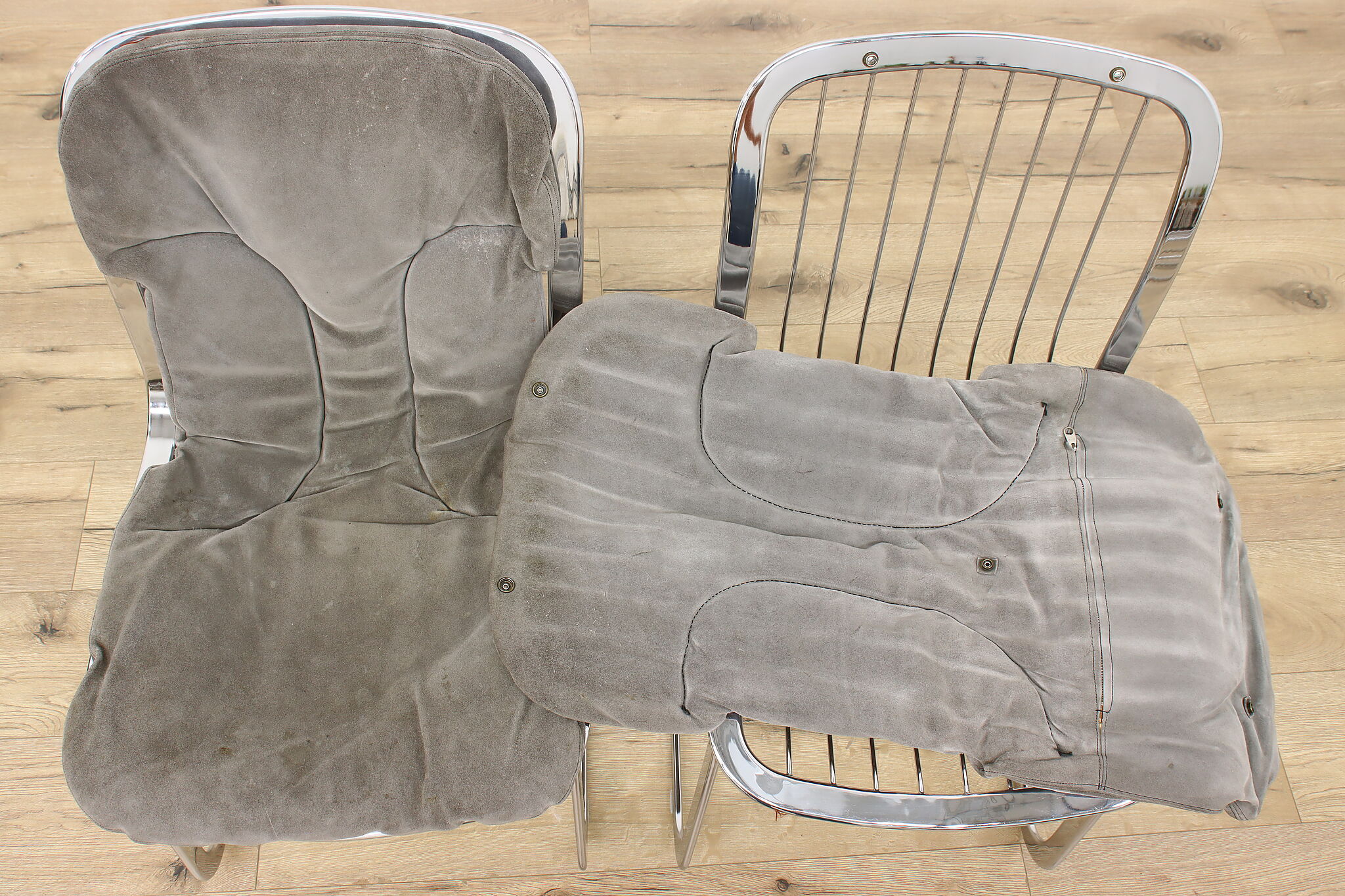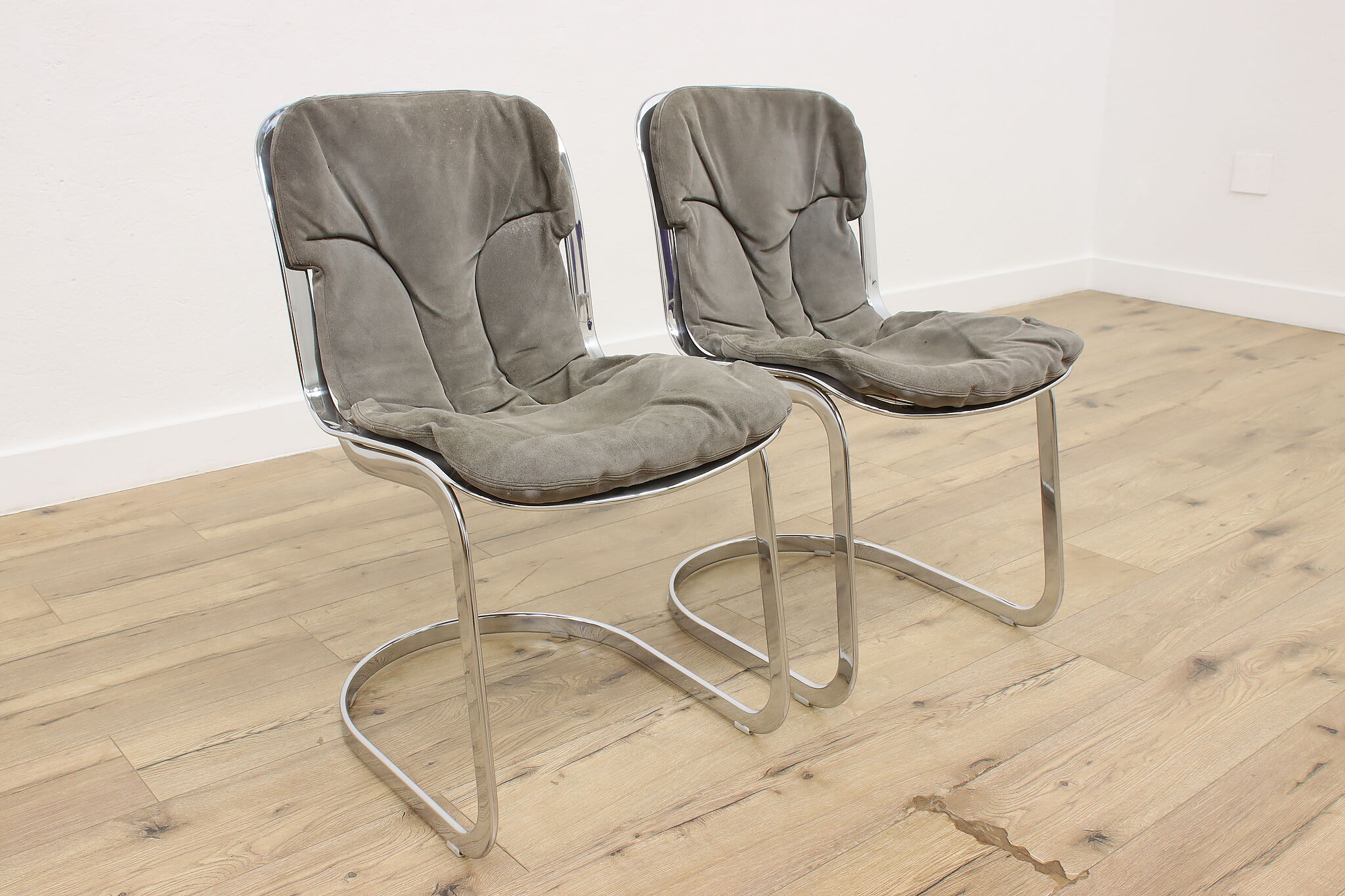 When thinking of the Midcentury Modern period, most people picture gleaming wood credenzas and open bookcases. However, the period also produced chrome pieces with different fabrics to create visual contrast. This set of four Italian chairs includes suede cloth and worn suede leather upholstery options for you to choose which one best fits your space!