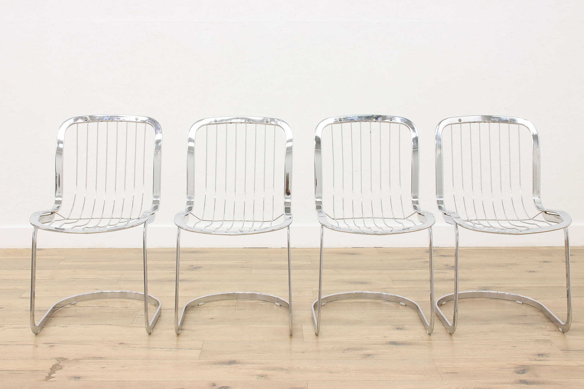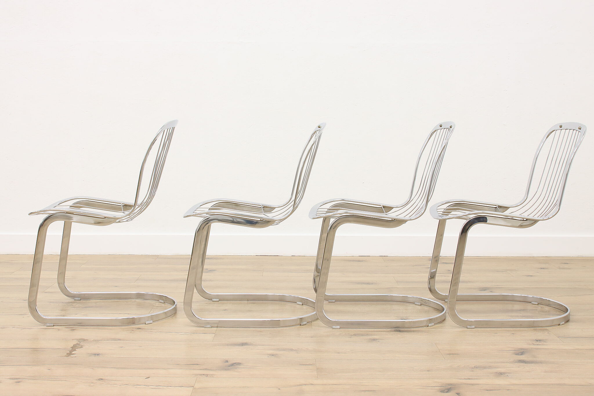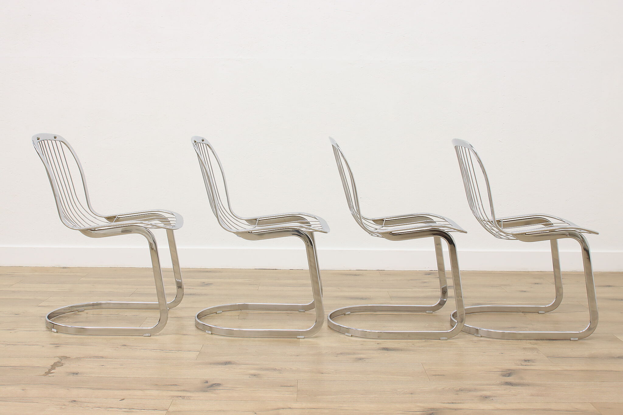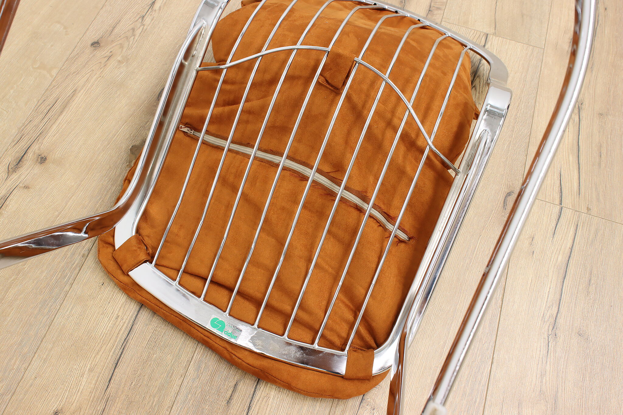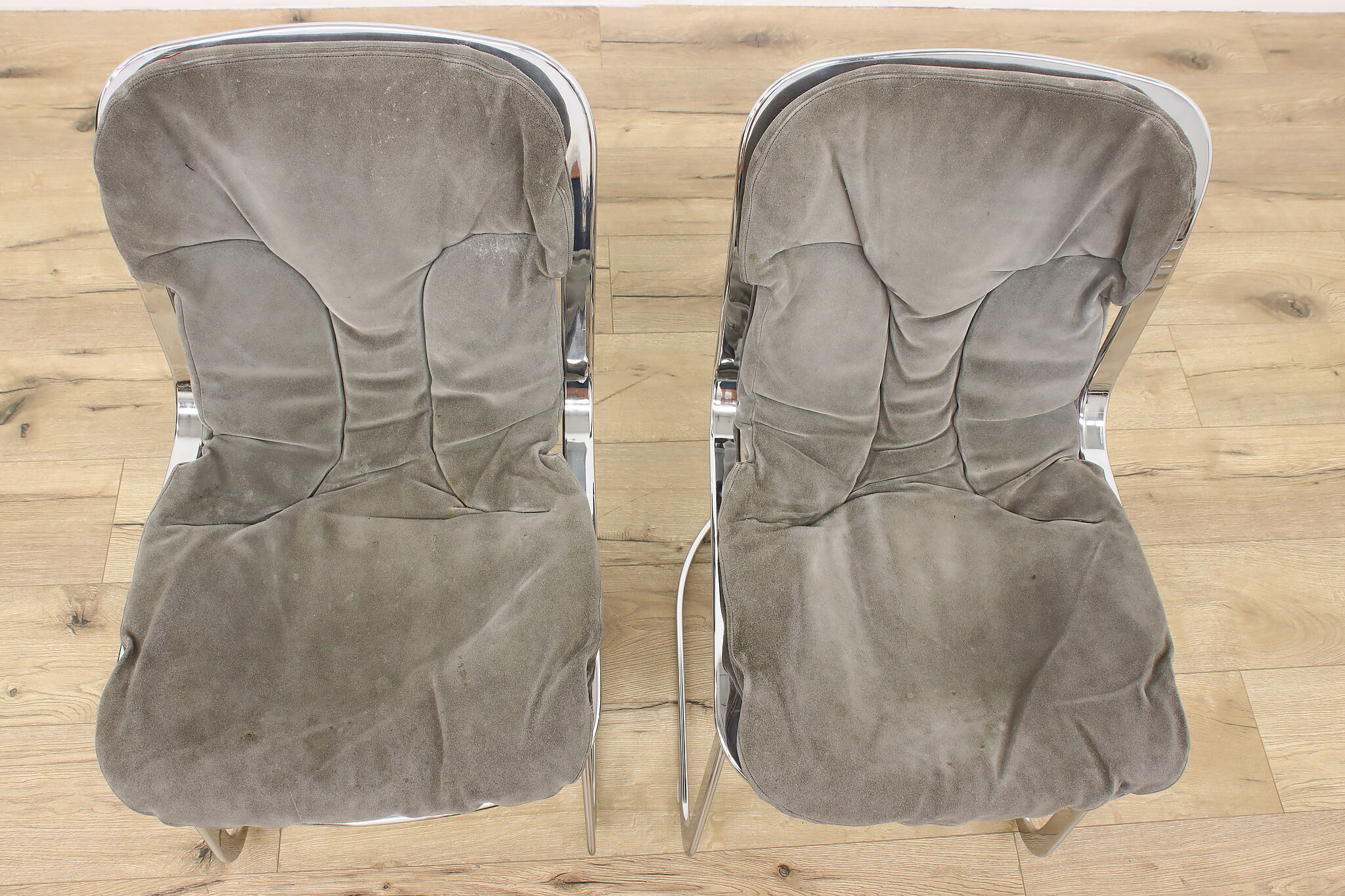When thinking of the Midcentury Modern period, most people picture gleaming wood credenzas and open bookcases. However, the period also produced chrome pieces with different fabrics to create visual contrast. This set of four Italian chairs includes suede cloth and worn suede leather upholstery options for you to choose which one best fits your space!