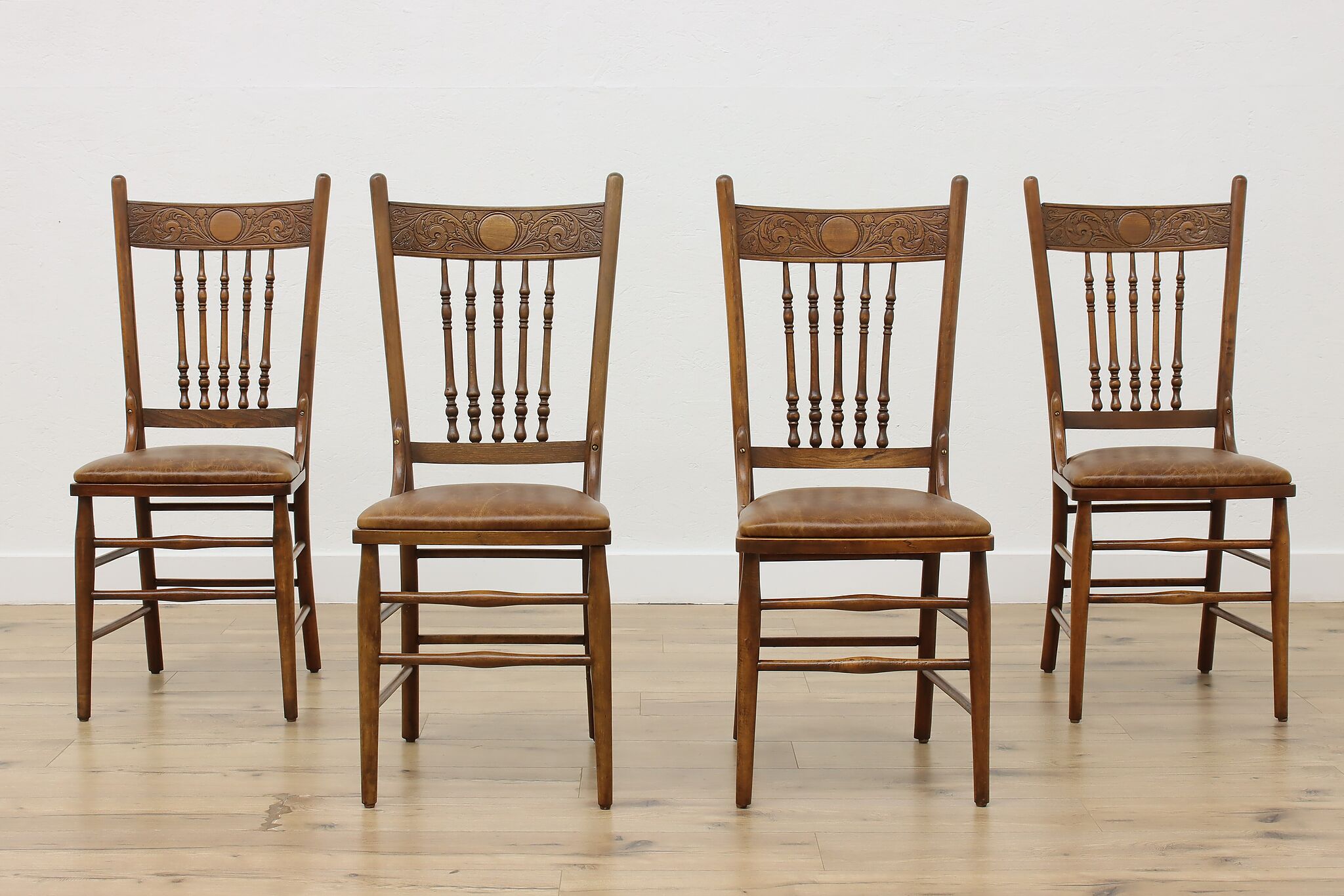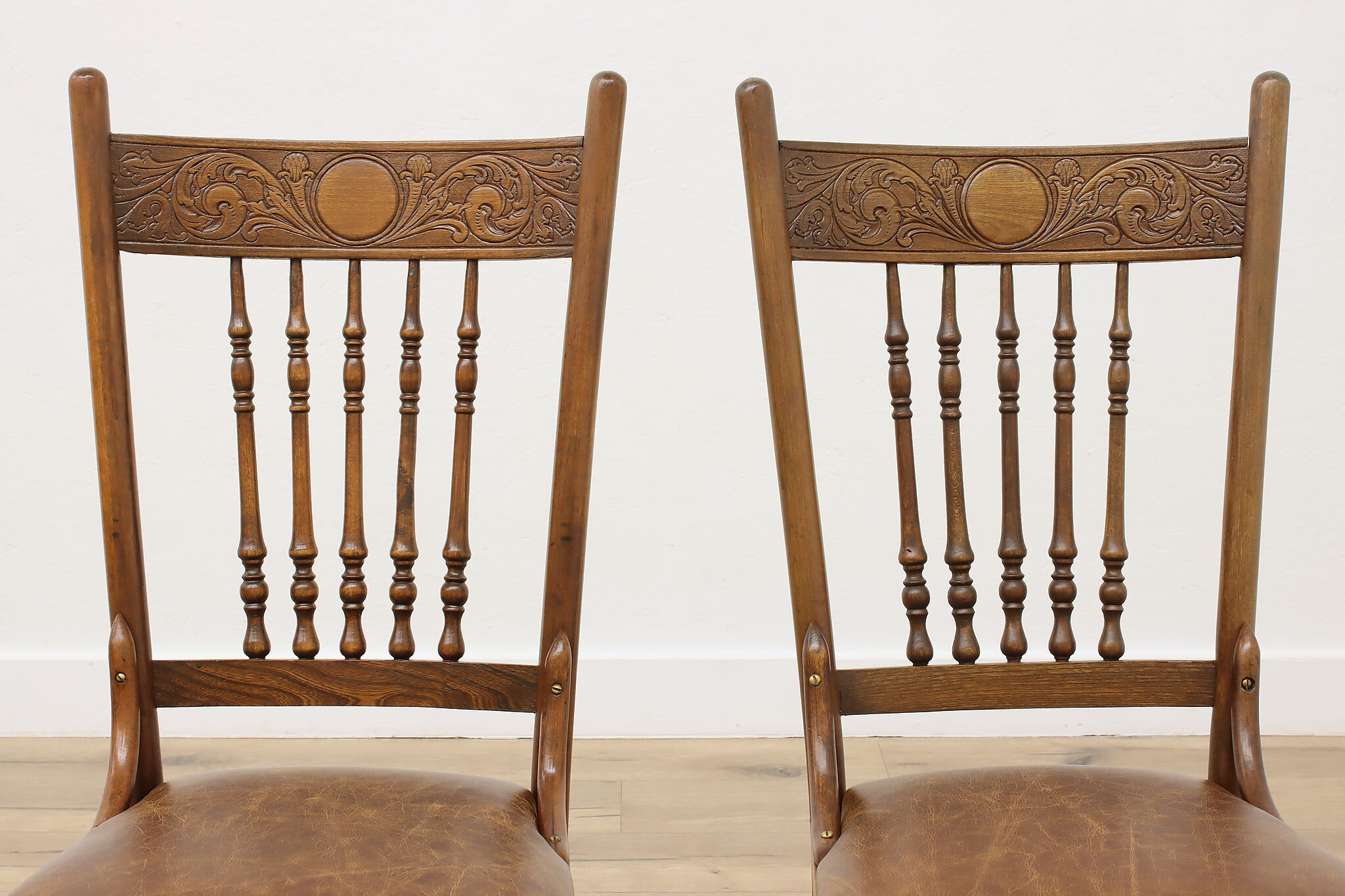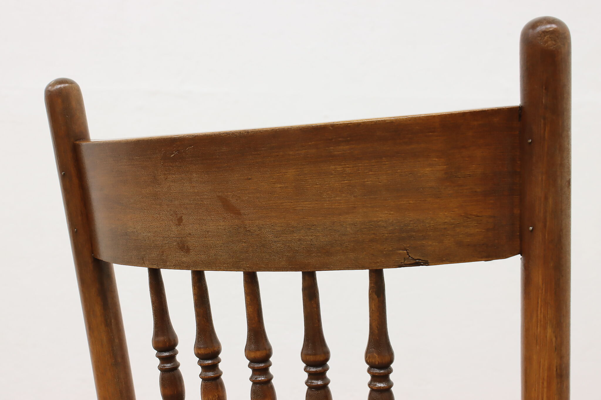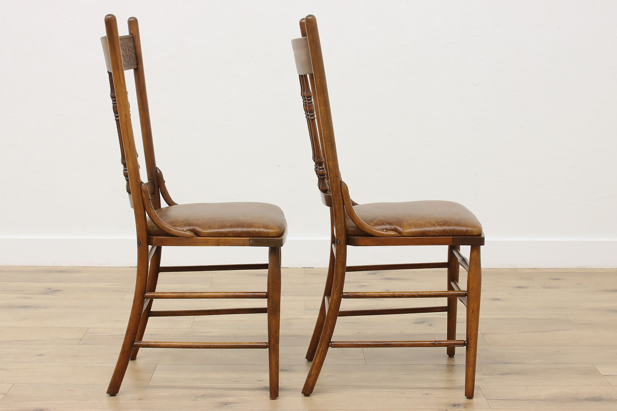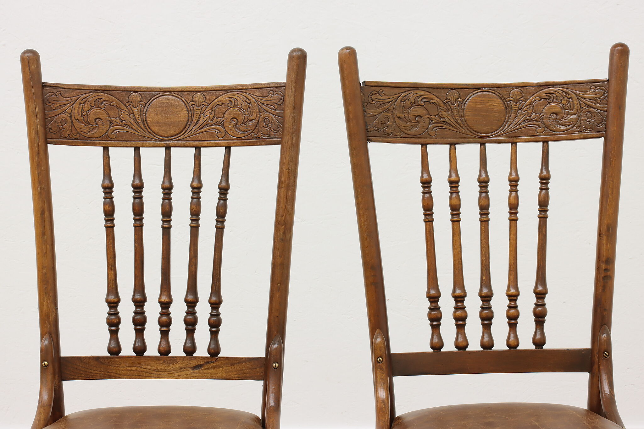 "Pressback" carved chairs were popular around 1900 for being affordable and still retaining its farmhouse country charm.