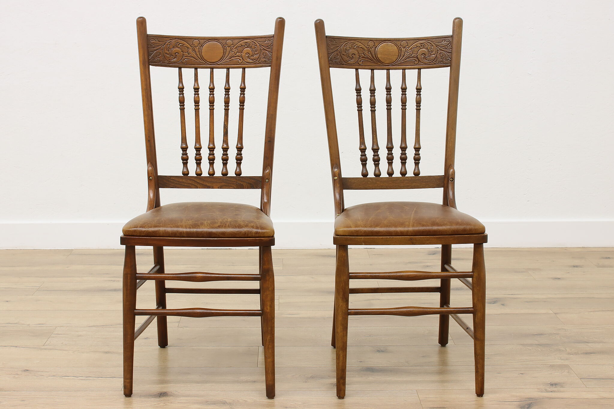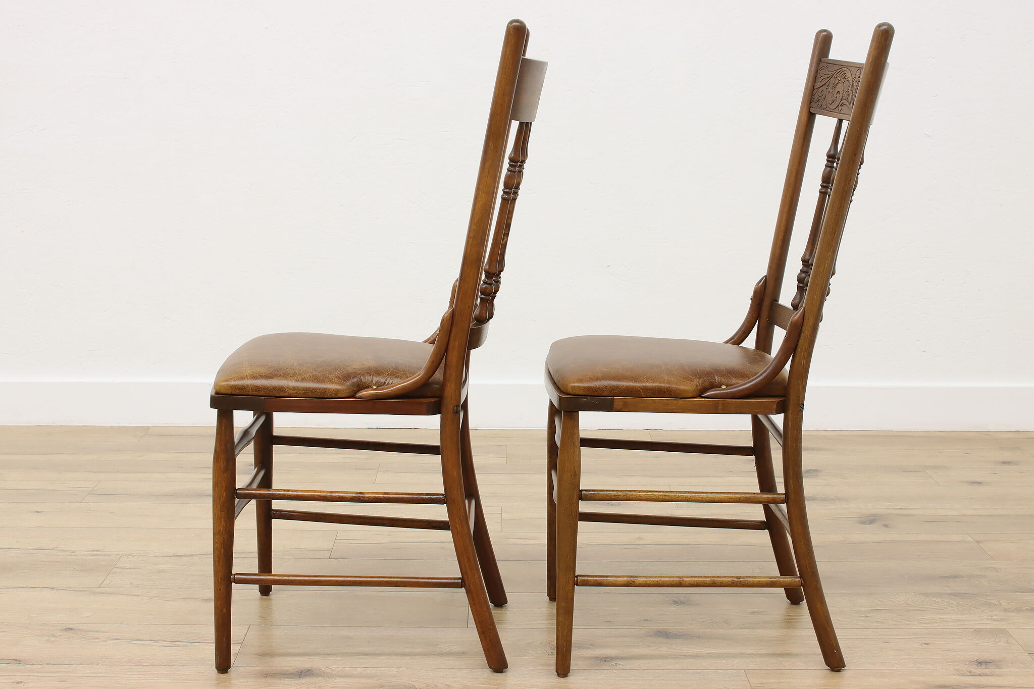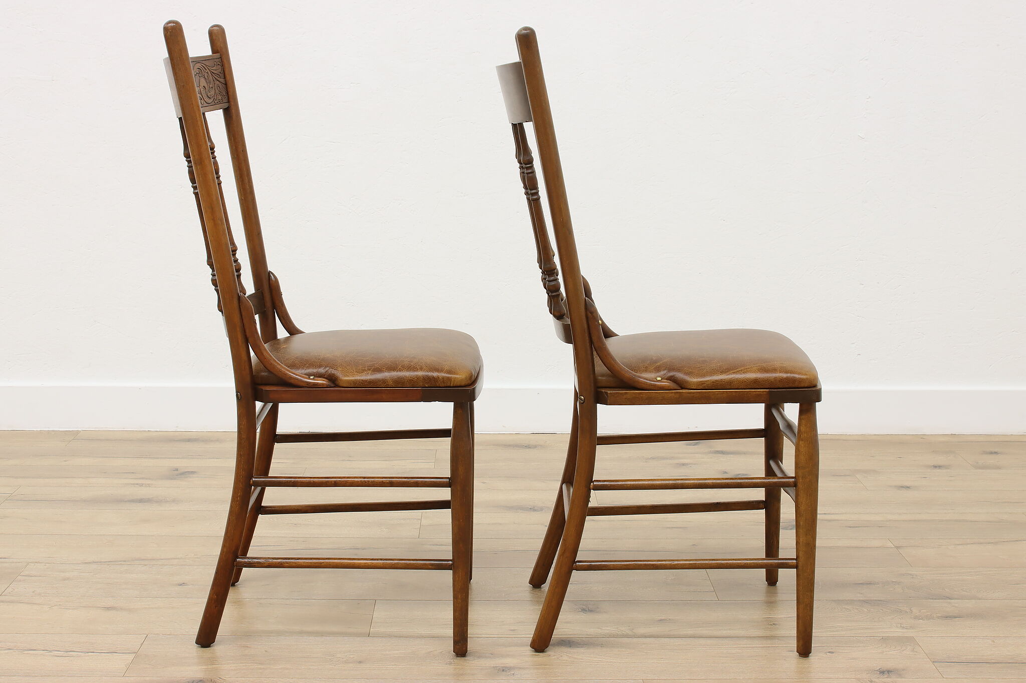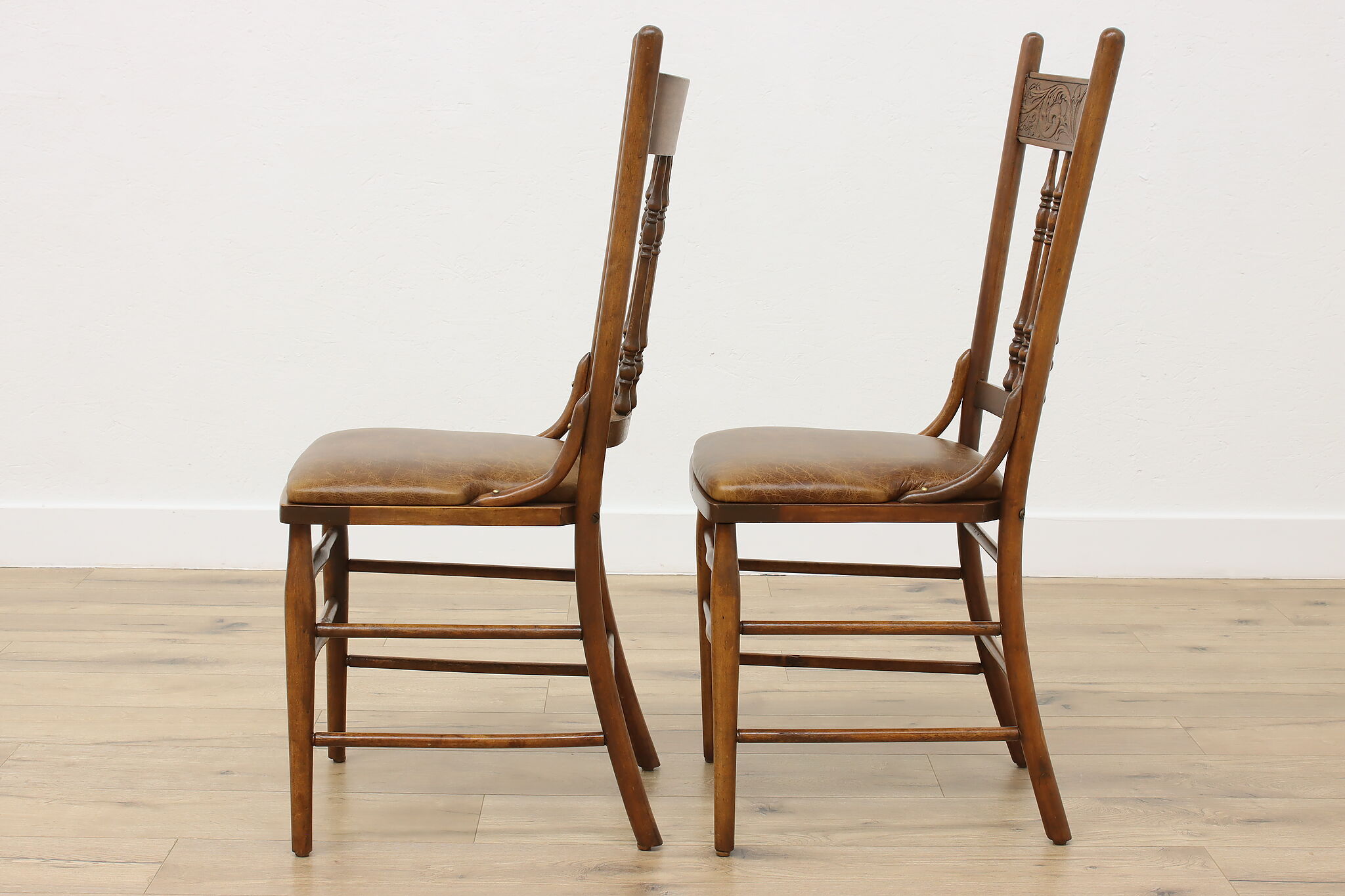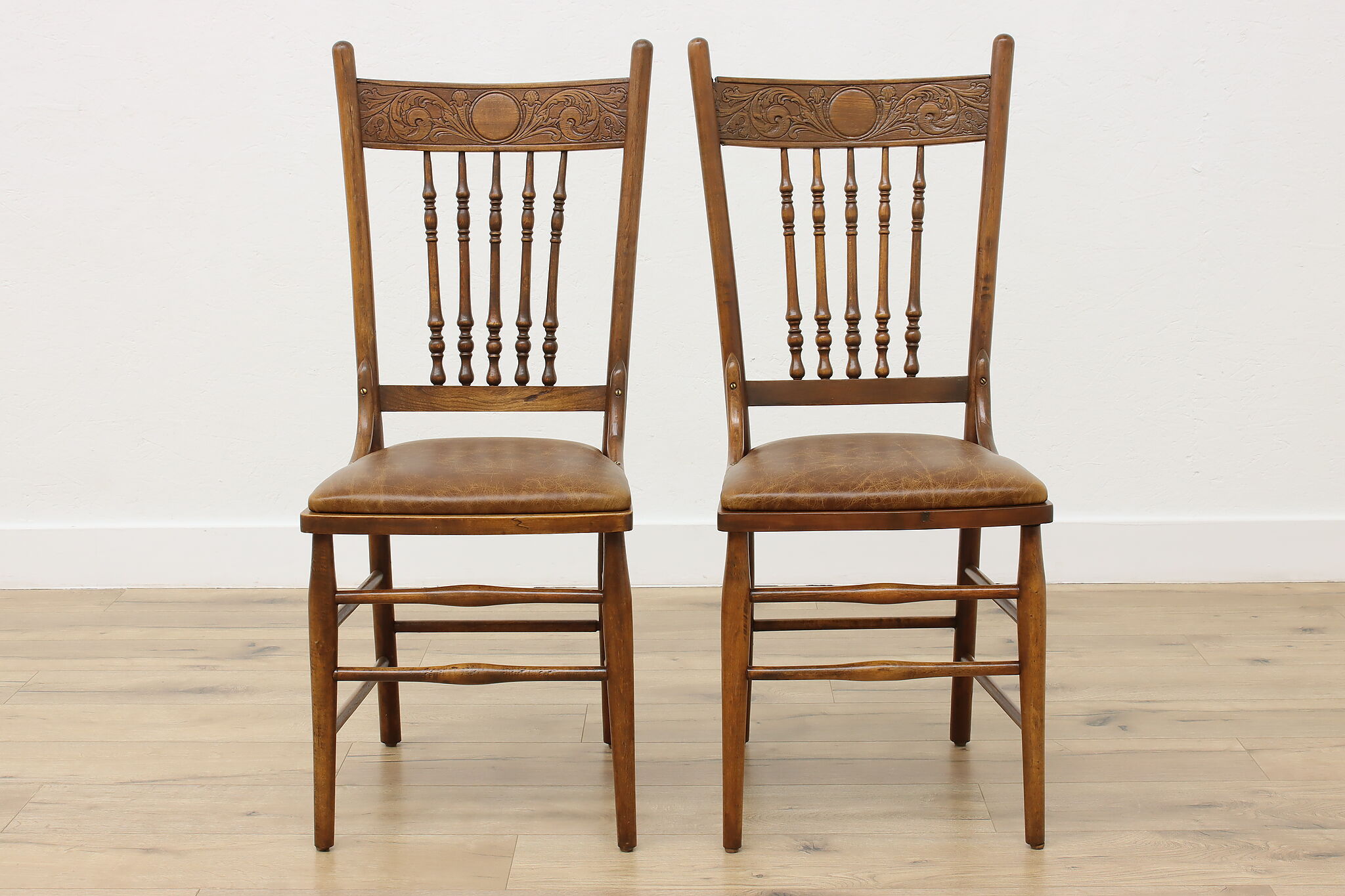 "Pressback" carved chairs were popular around 1900 for being affordable and still retaining its farmhouse country charm.