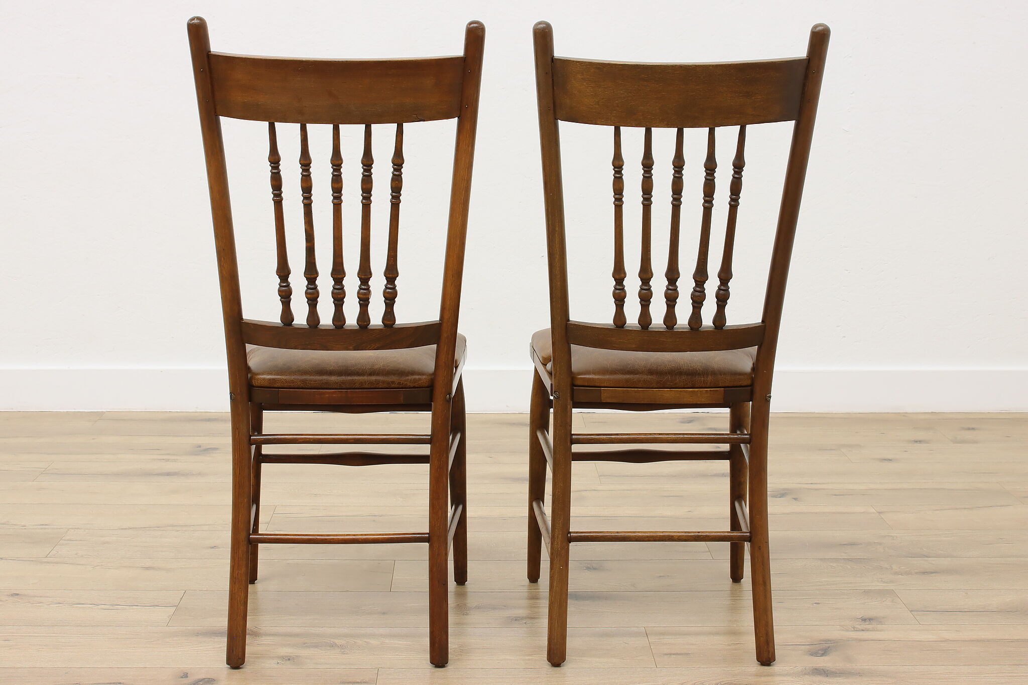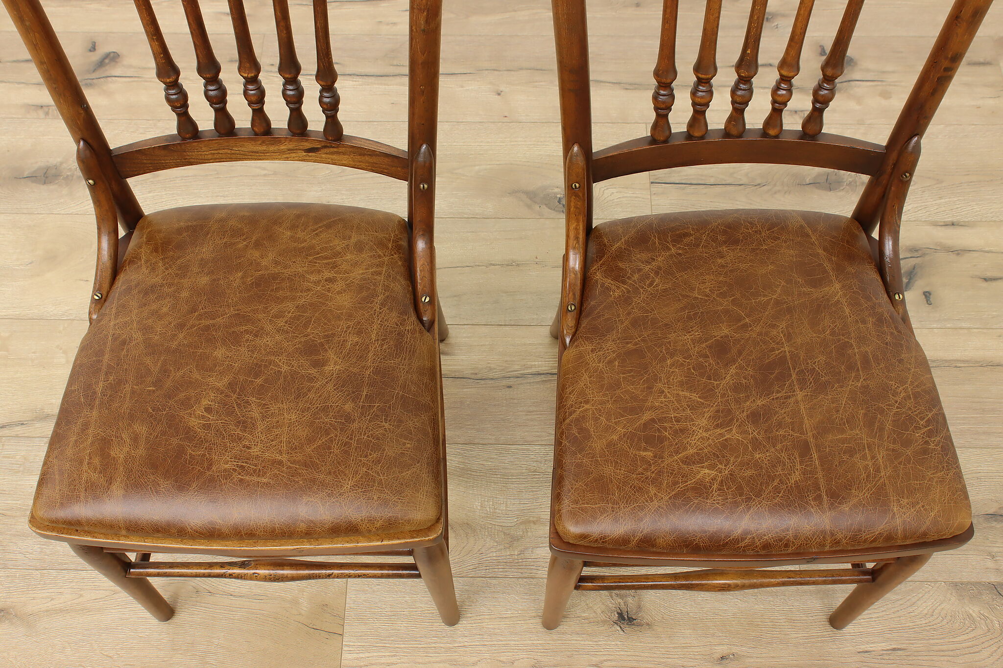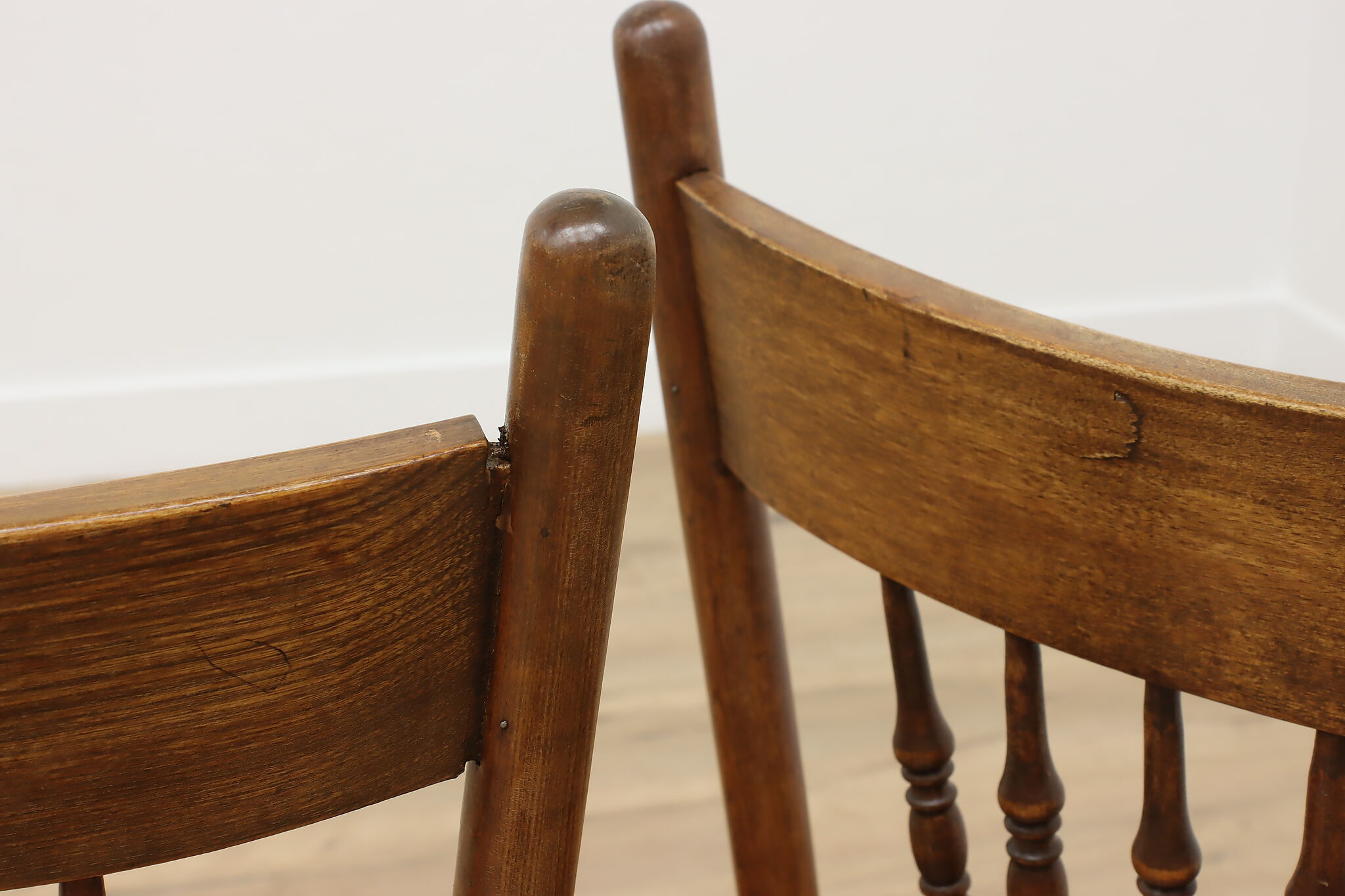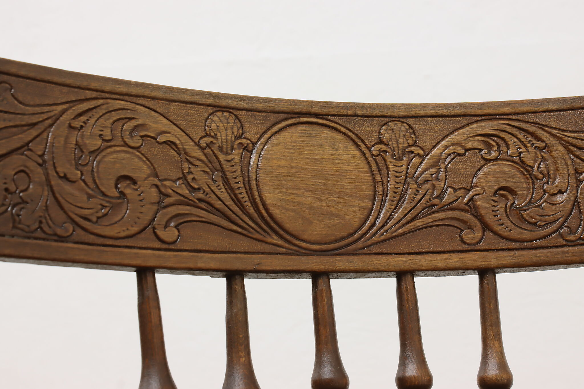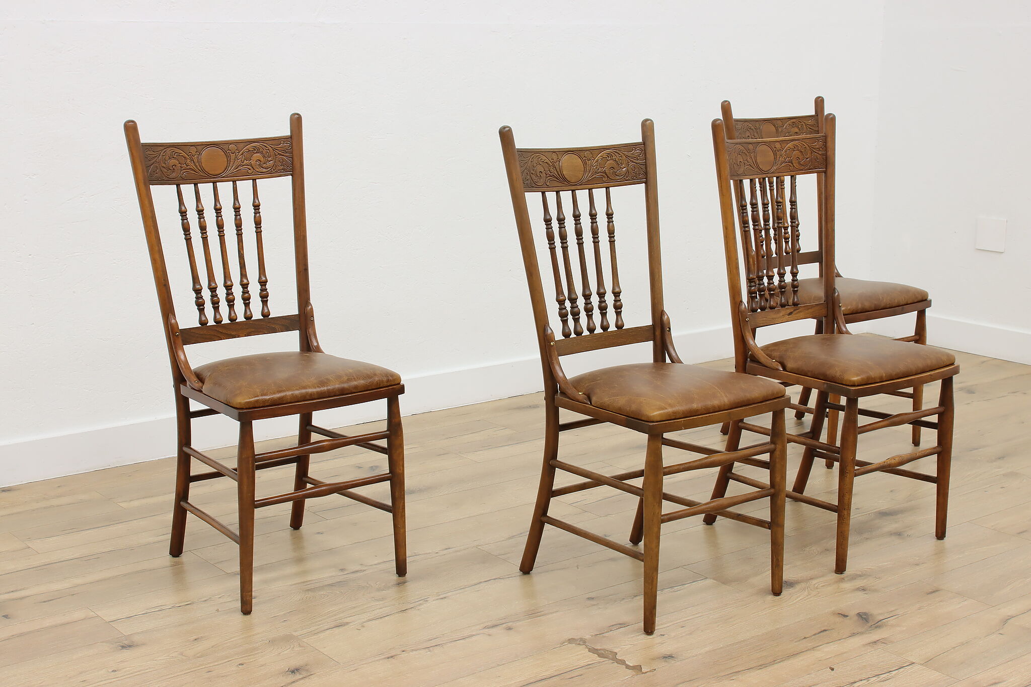"Pressback" carved chairs were popular around 1900 for being affordable and still retaining its farmhouse country charm.