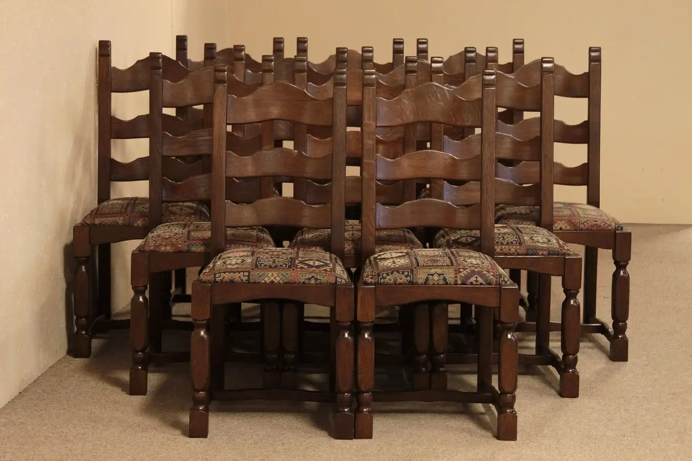 Ruggedly crafted of solid quarter-sawn oak about 1920, this set of 12 dining chairs has been newly upholstered. The deep brown finish is excellent, these strong chairs are tight and completely solid, ready for another generation's use.