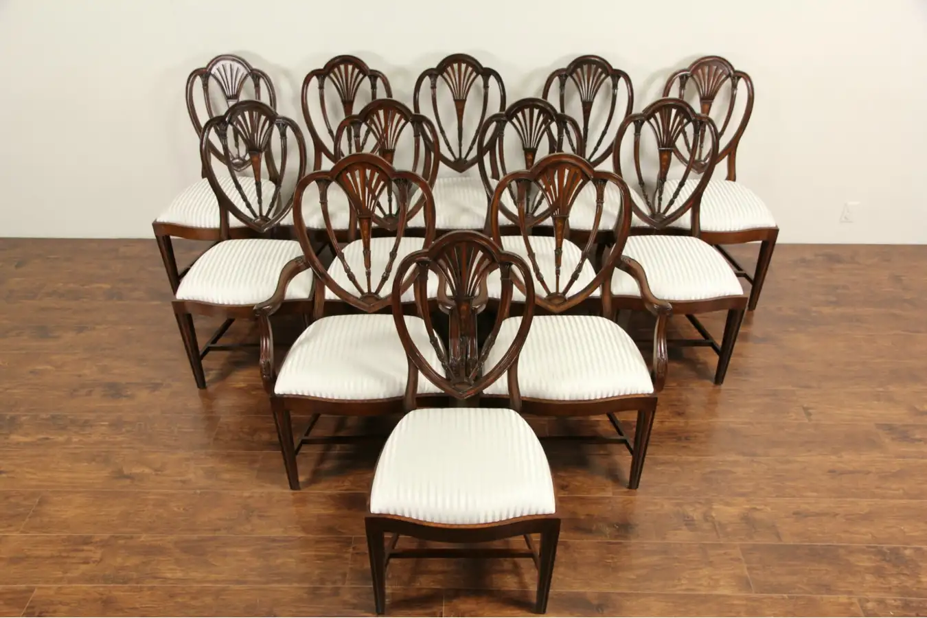 A set of twelve new traditional Georgian shield back dining chairs are pierced and hand carved with graceful lines and large seats. The hand rubbed finish is excellent, there is inlaid marquetry in the backs.