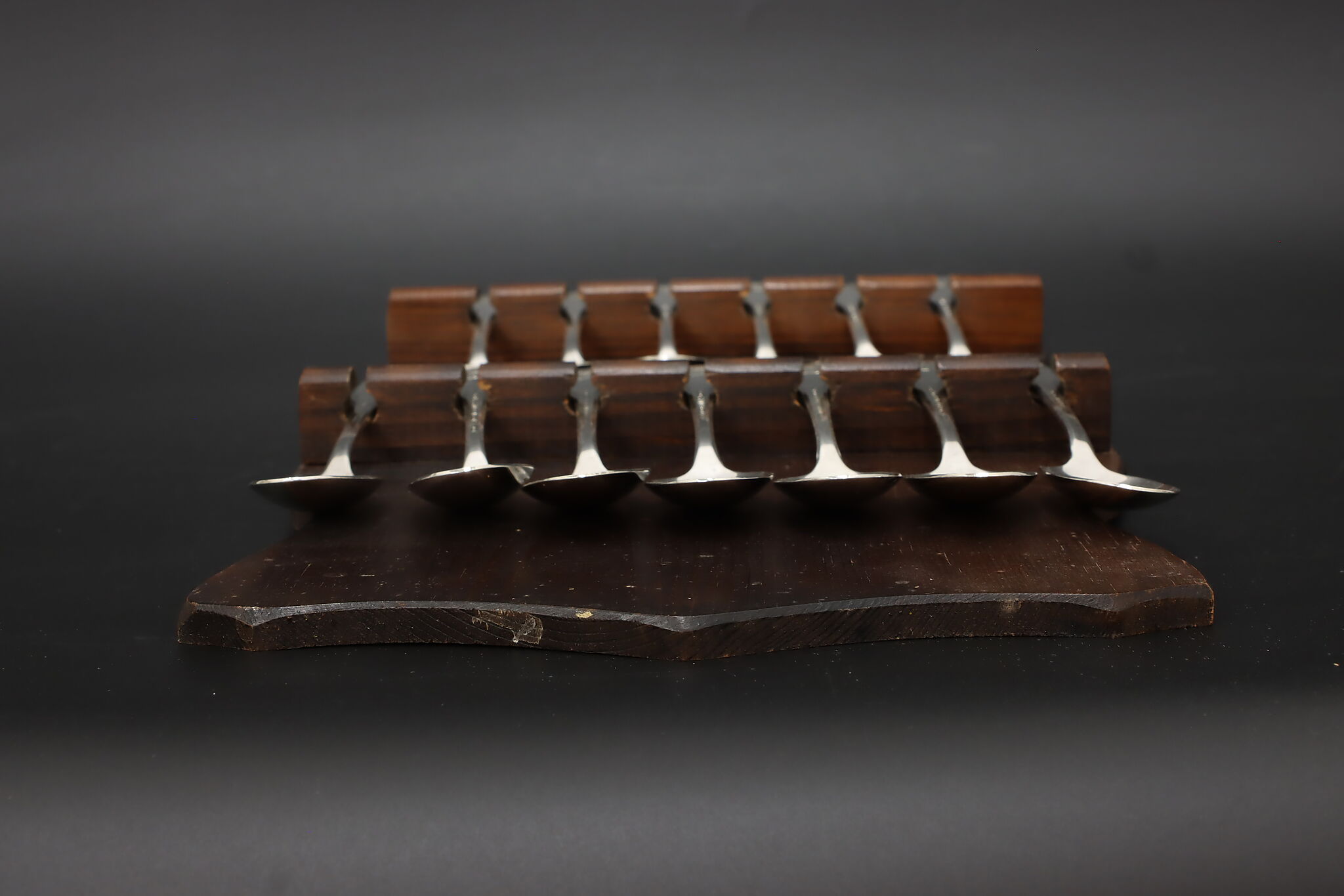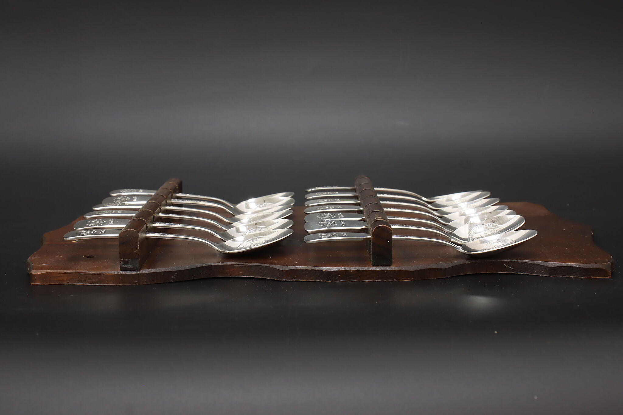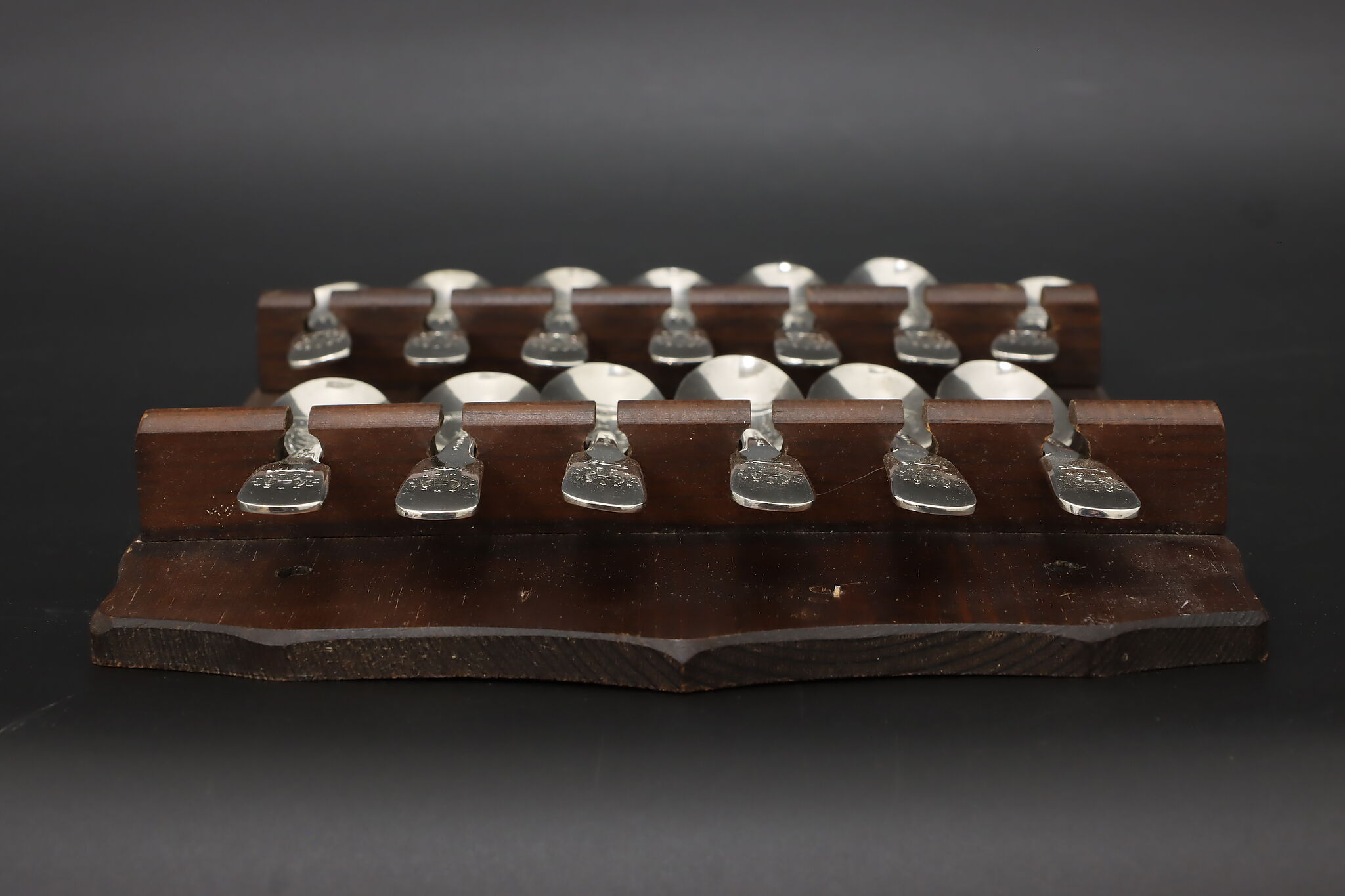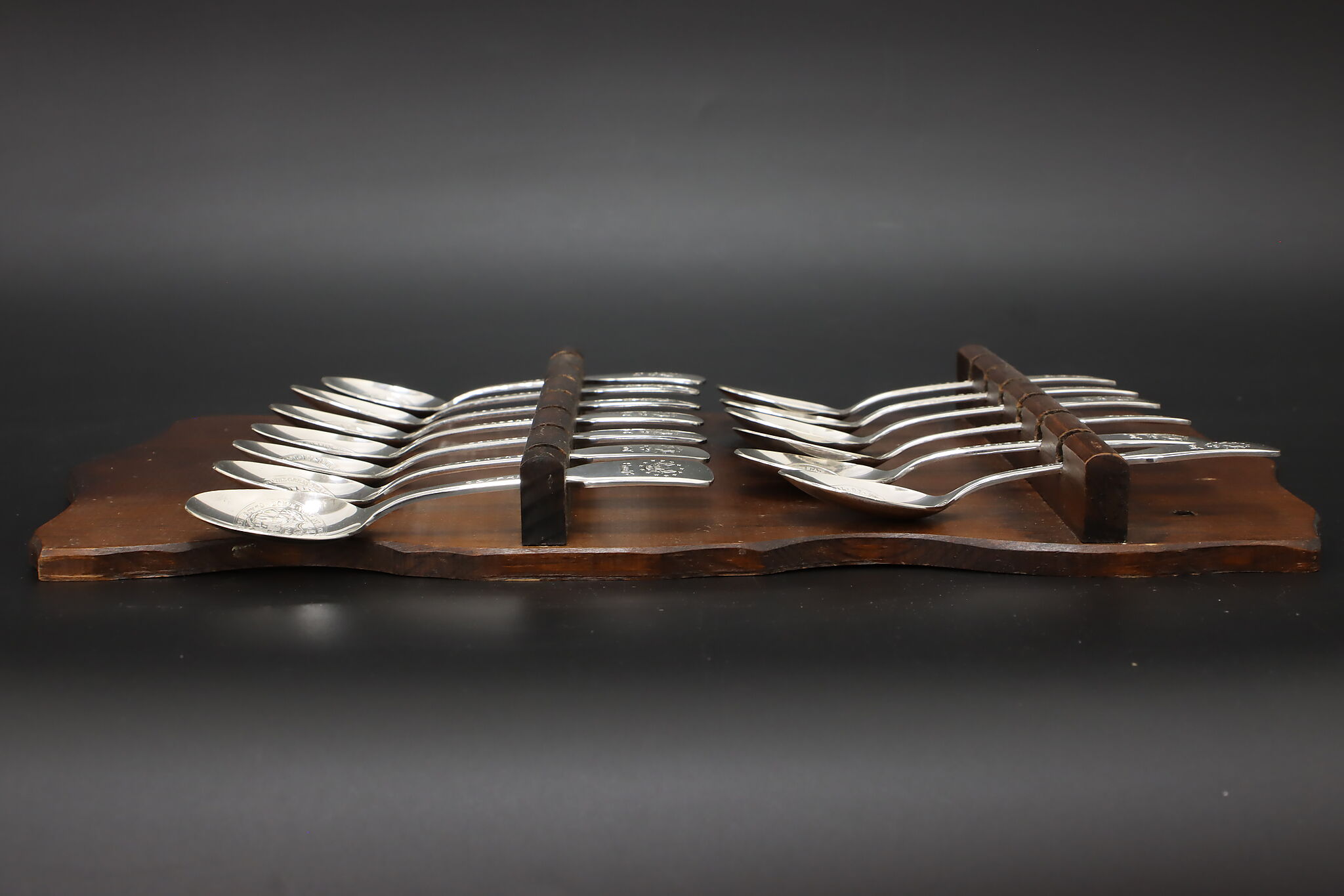 This set of thirteen silver plated spoons were created to celebrate America's bicentennial celebration in 1976, honoring the original thirteen colonies.