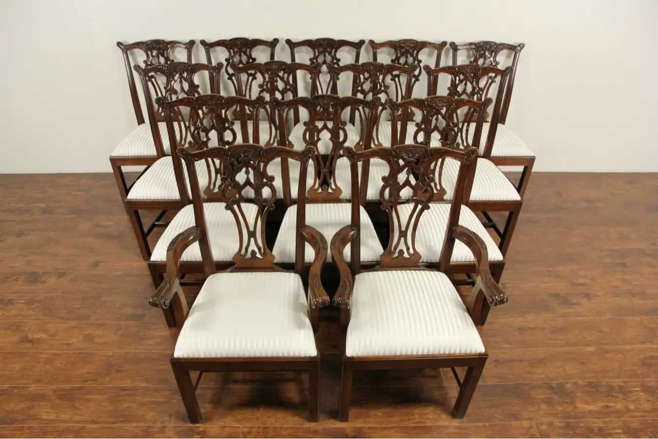 Two armchairs are 25" wide, 23" deep and 41" tall, twelve side chairs measure 22" wide, seats are 20" tall.