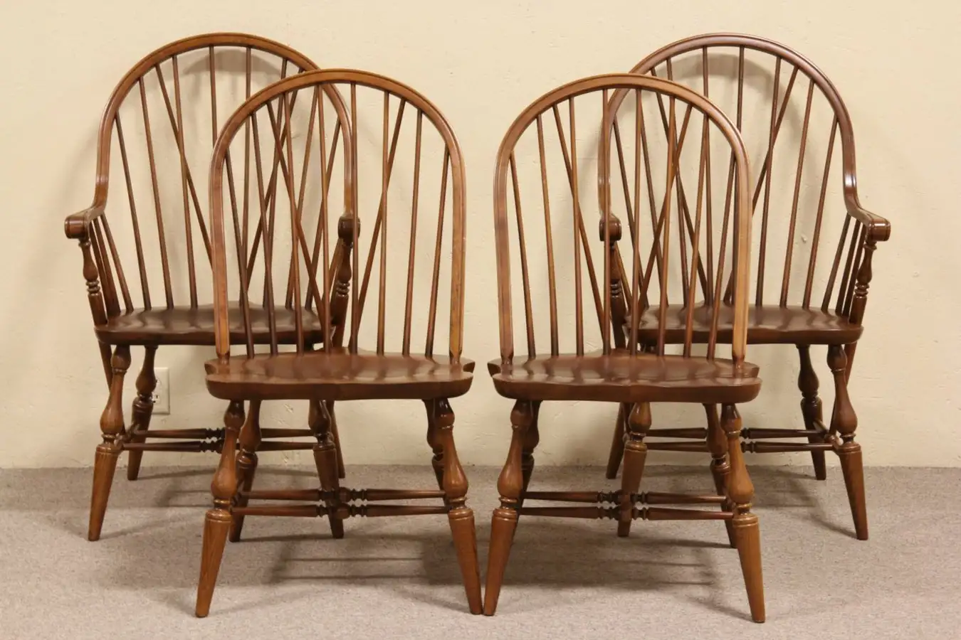 Signed by noted maker, "Pennsylvania House," a set of four classic Windsor design armchairs are about 25 years old and in excellent condition.