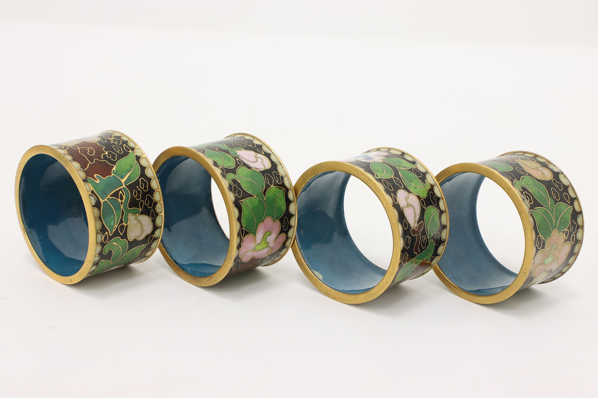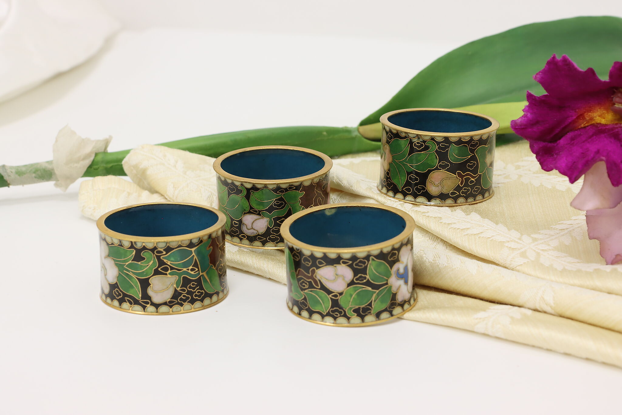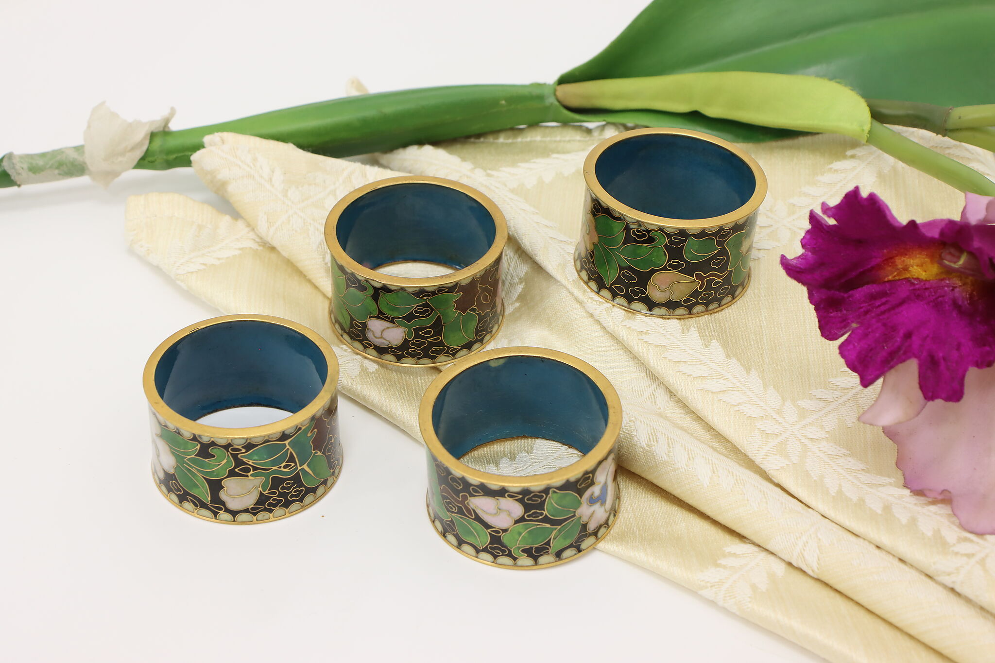 This beautiful set of four traditional "cloisonne" or intricate enamel over brass napkin rings would be wonderful given as gifts.