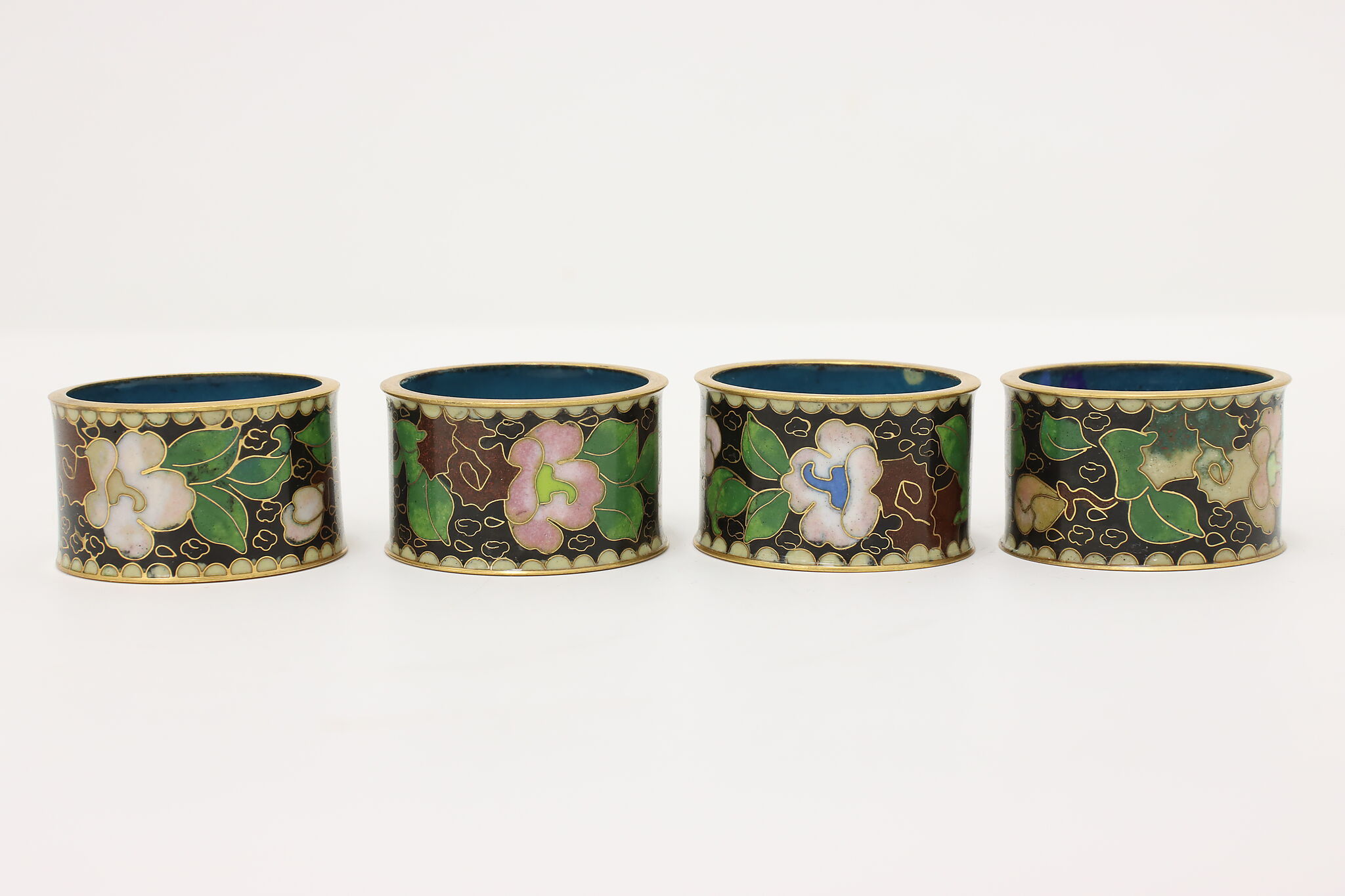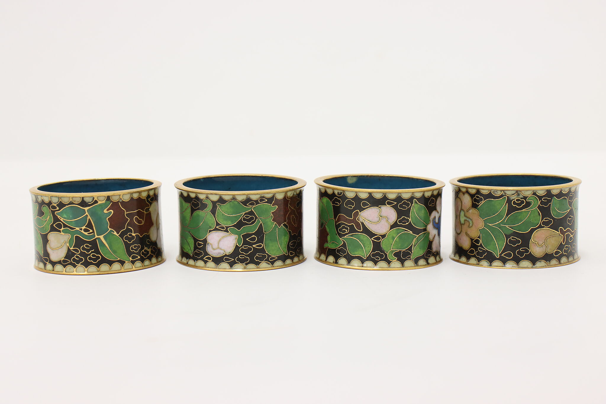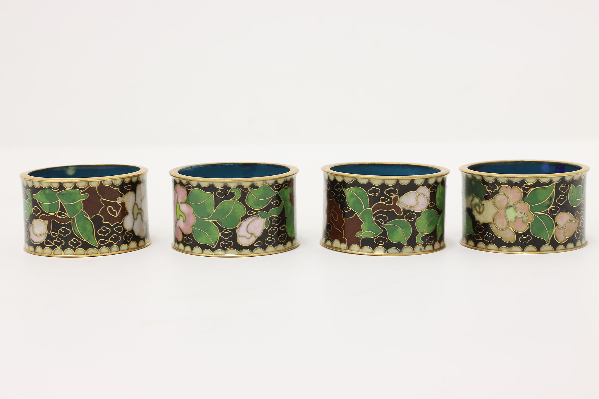 This beautiful set of four traditional "cloisonne" or intricate enamel over brass napkin rings would be wonderful given as gifts.