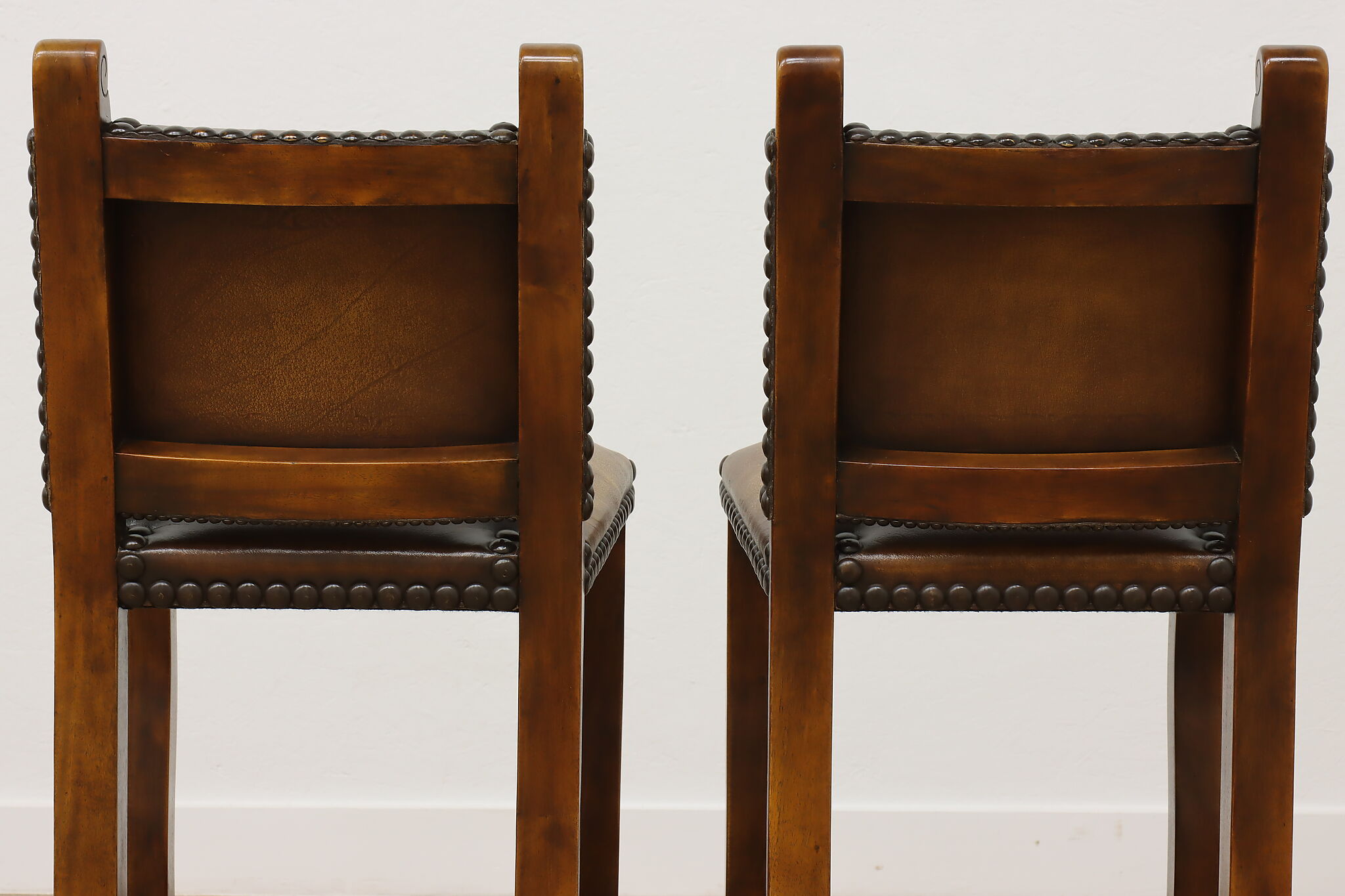 A set of four Spanish Colonial bar or counter stools have wonderfully distressed leather upholstery for antique charm in a modern home.