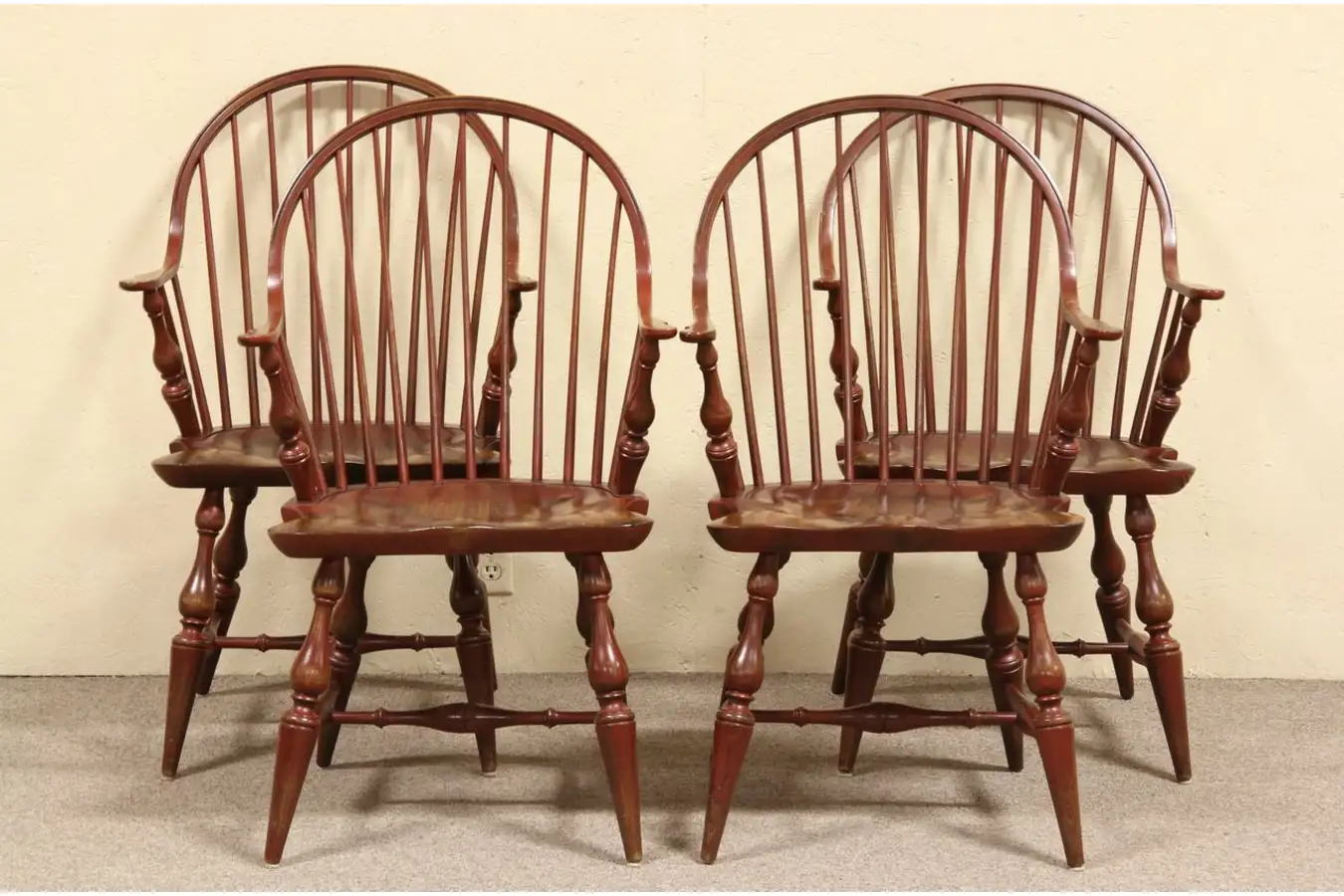 This set of four traditional "Windsor" design dining or game table armchairs is about 15 years old. The reason that Windsor chairs have been made for 300 years is not just that they are strong and comfortable, it is also because of their graceful shape and delicate curving lines.