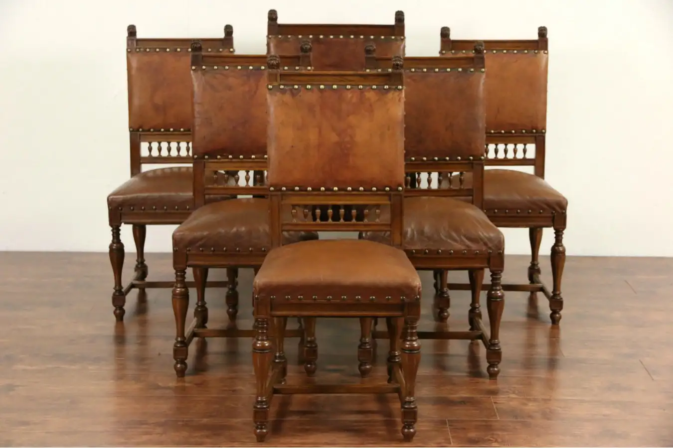 A set of six dining chairs were hand carved with lion heads in Italy about 1880, and have leather upholstery and brass nailheads.