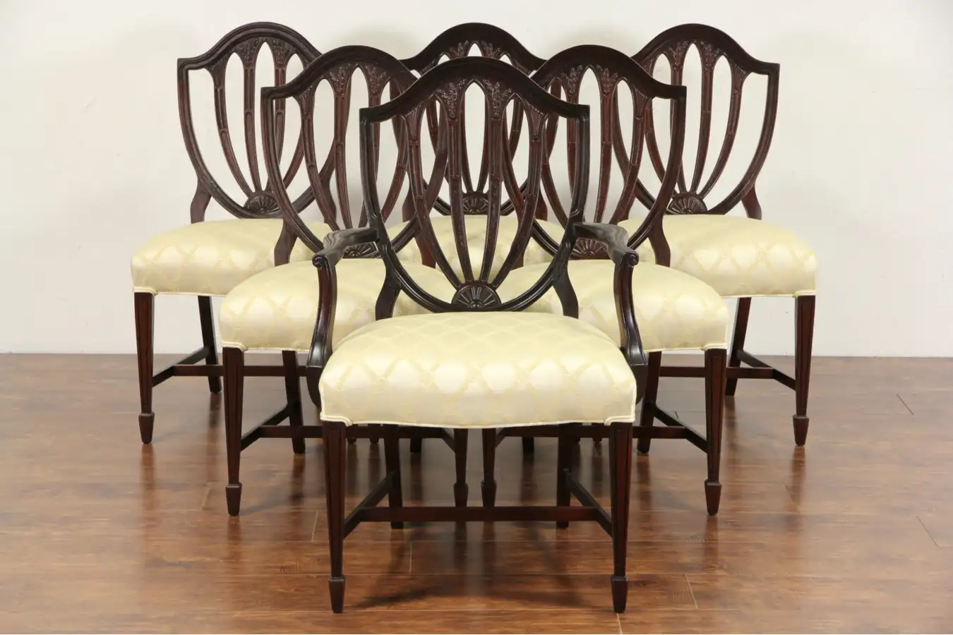 Carved in the Hepplewhite manner in the 1940's, this set of six shield back dining chairs are newly upholstered. Solid mahogany, the finish is in excellent condition.